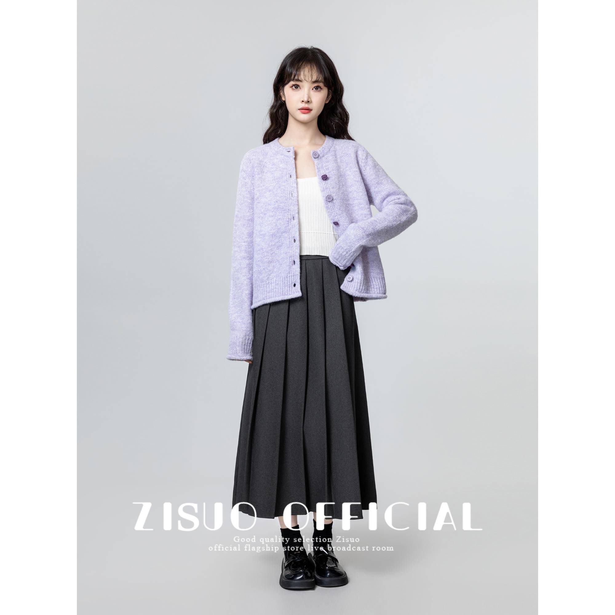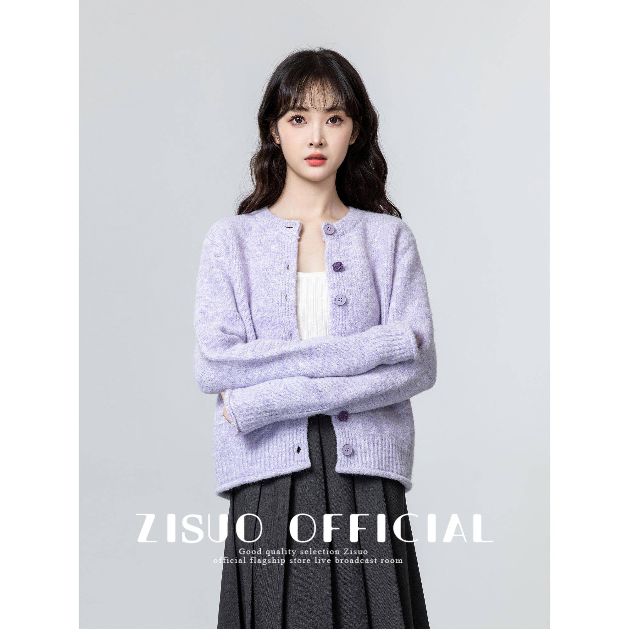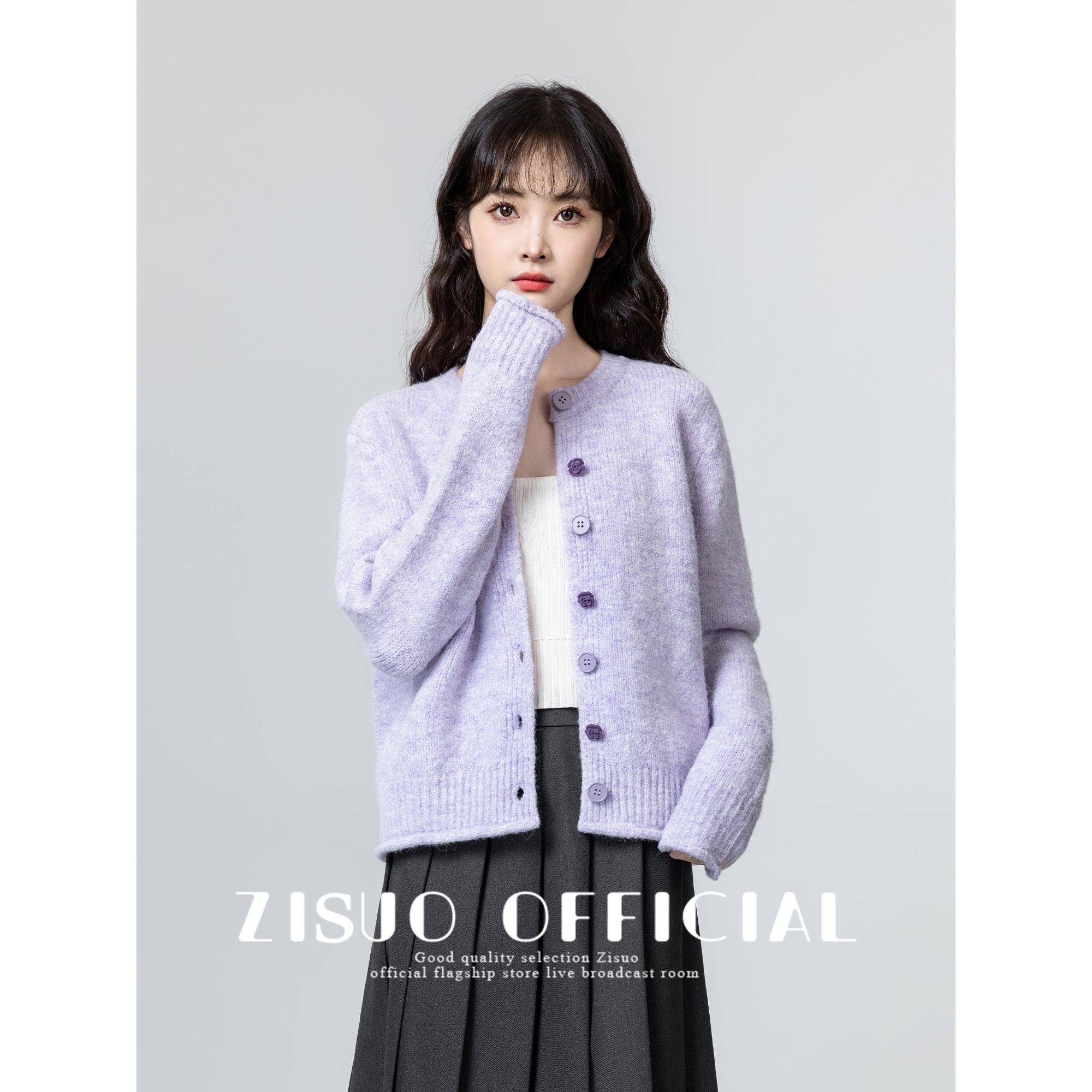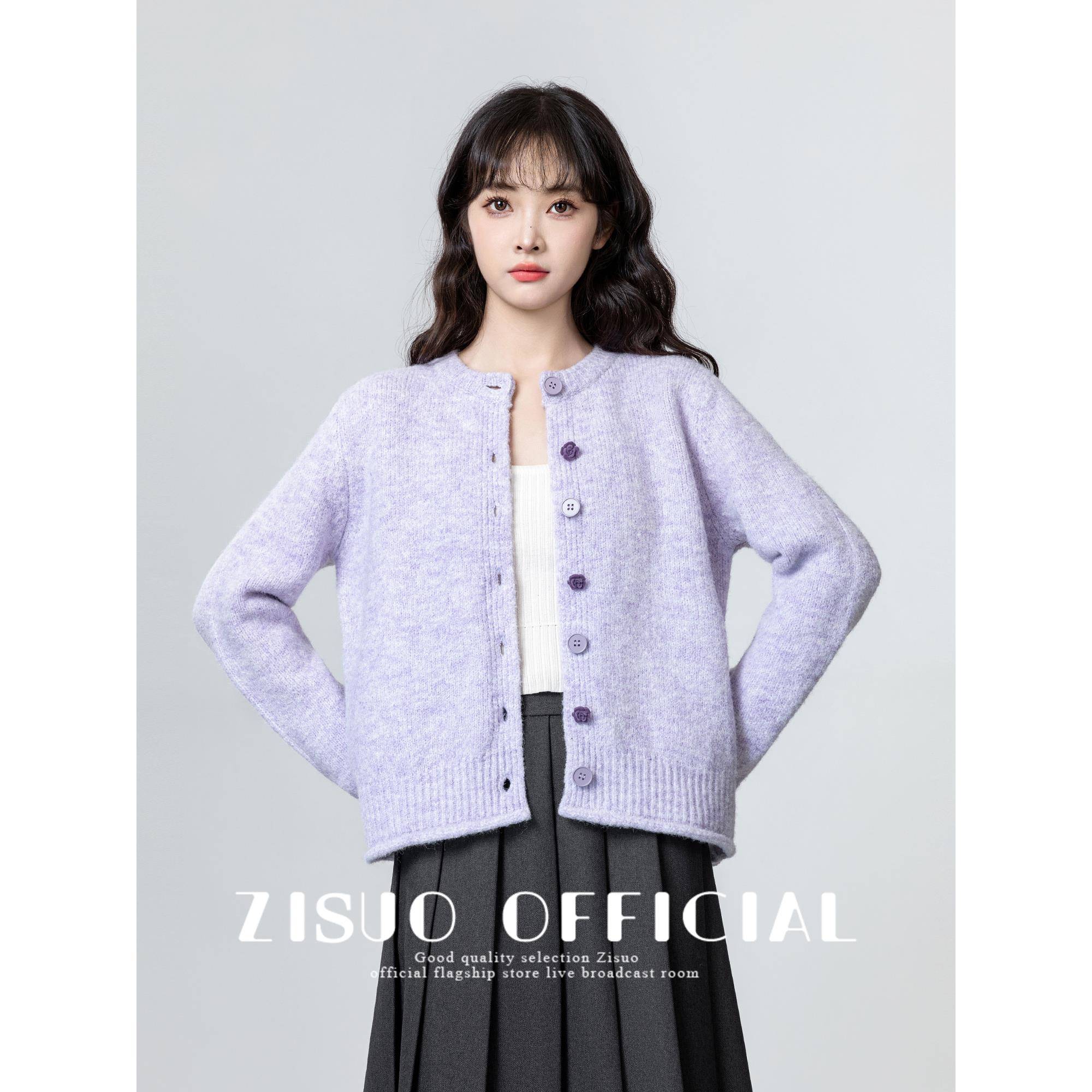 紫色圆领毛衣外套女2025春秋新款慵懒温柔风软糯针织开衫短款上衣