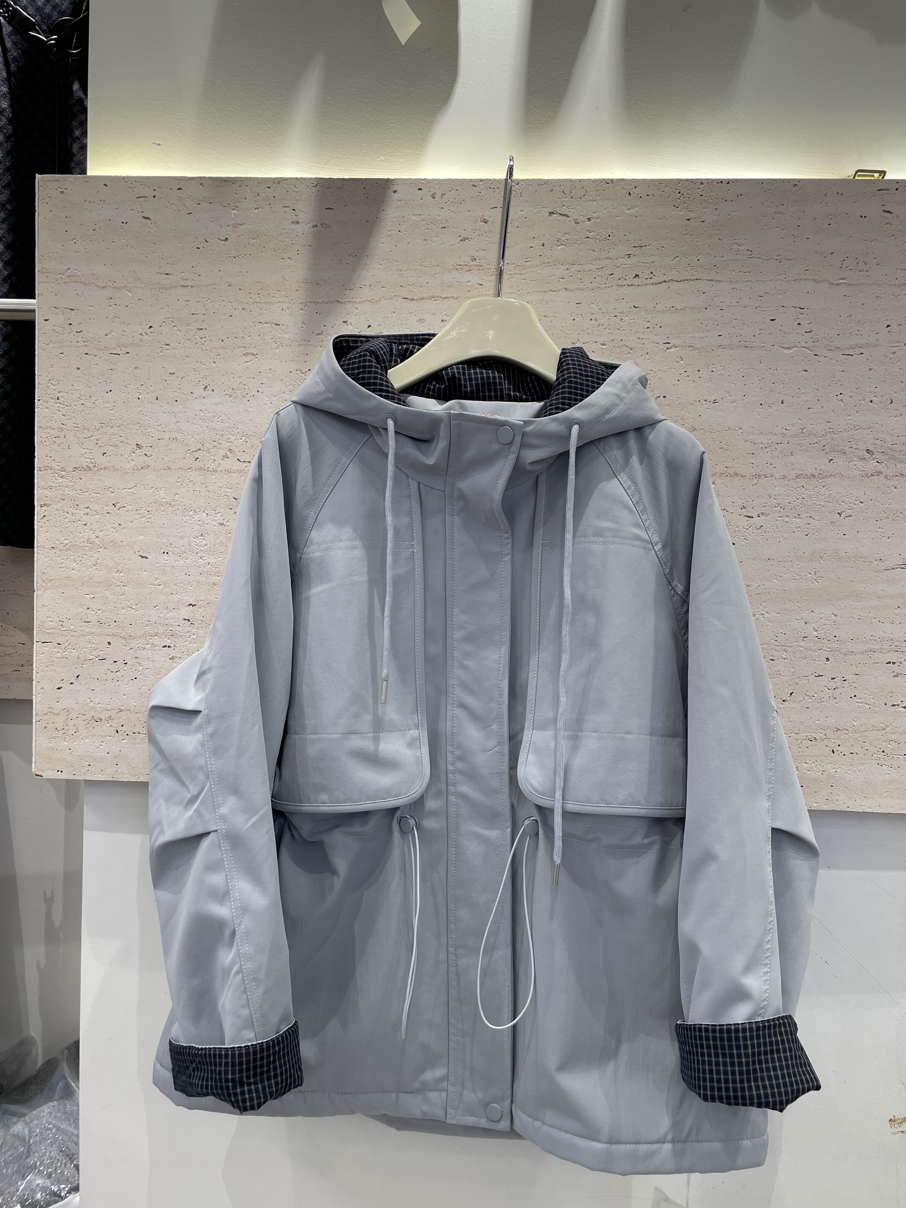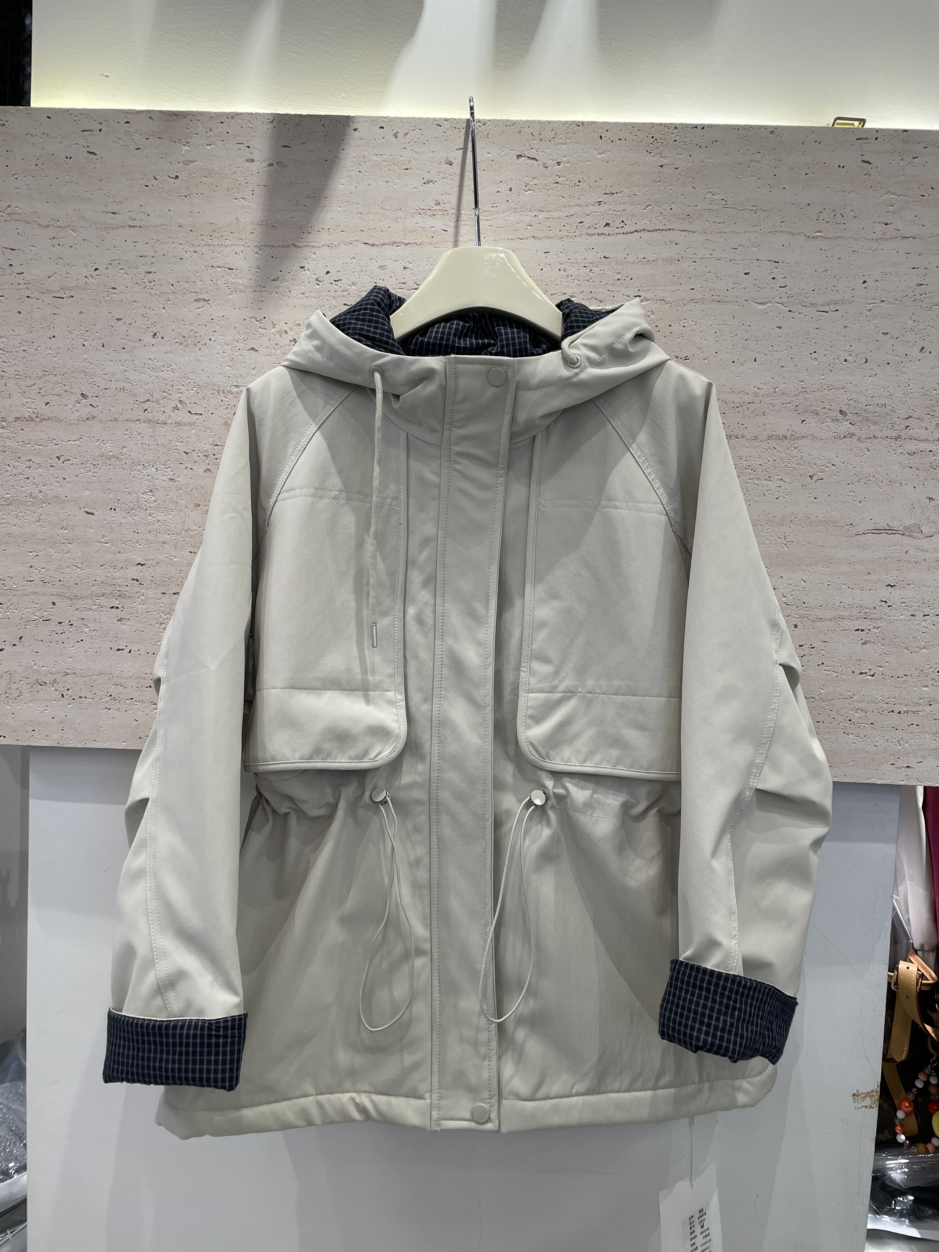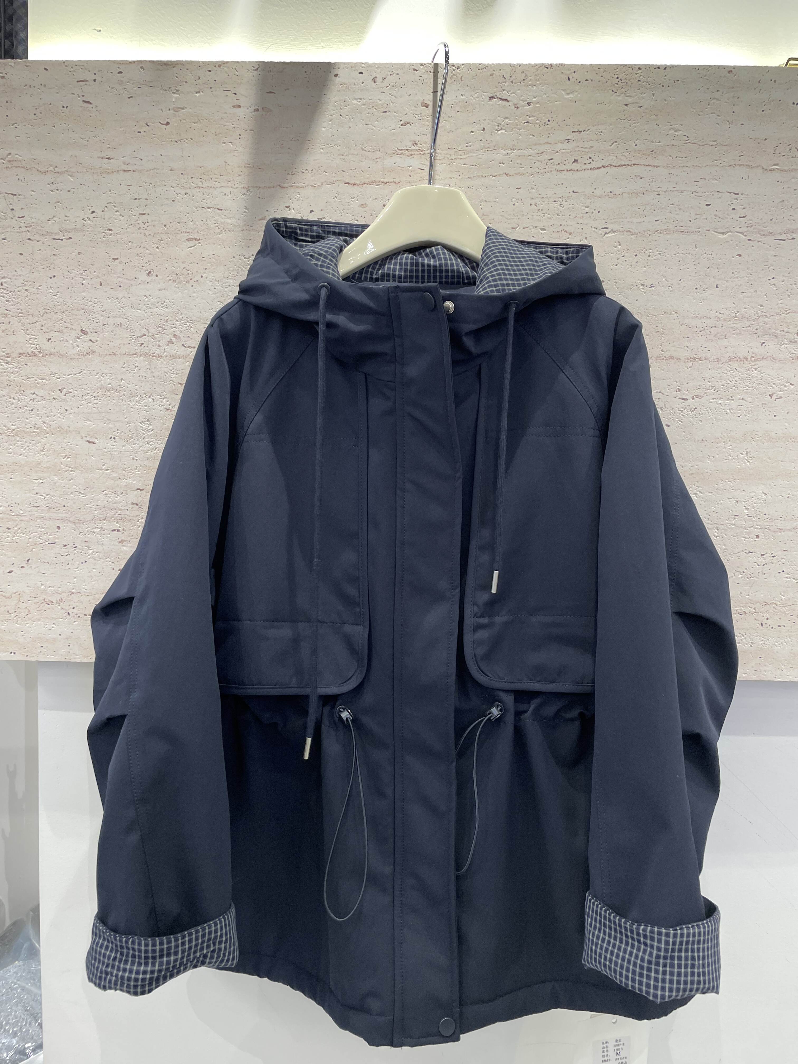 曼妮1856冬季颗粒绒加厚连帽抽绳收腰格子拼接宽松中长洋气外套女
