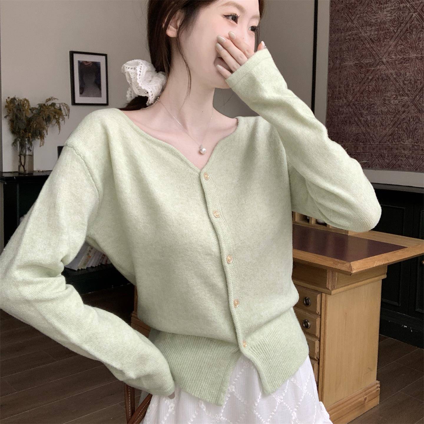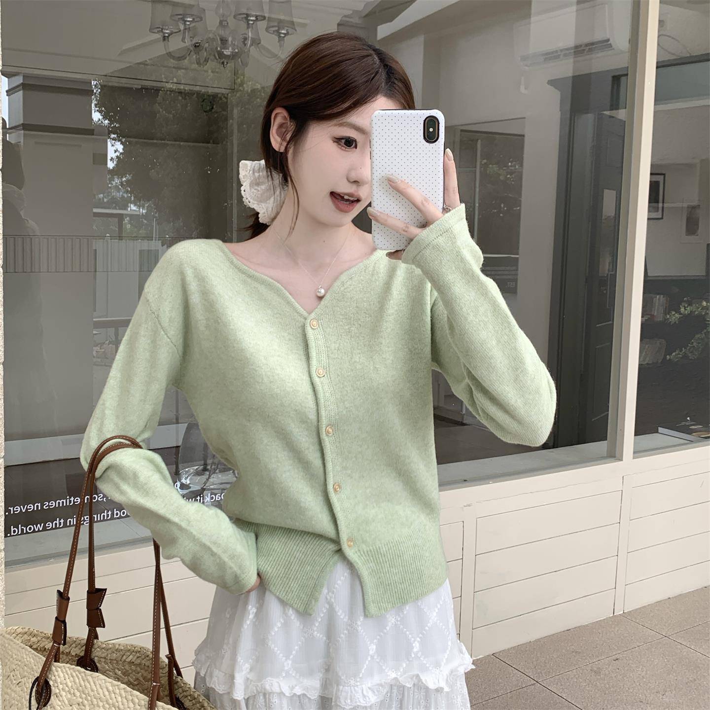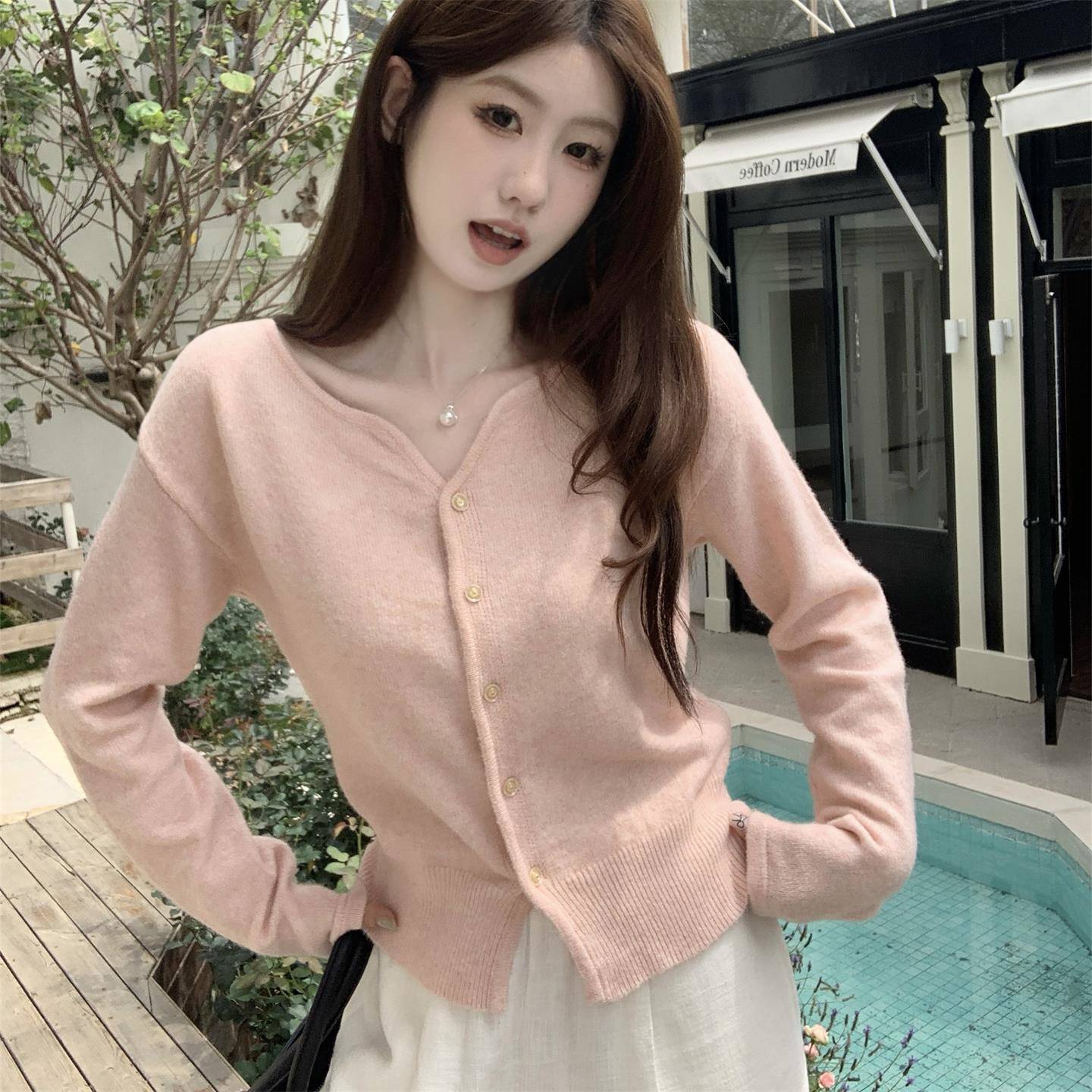初秋新款蜜桃粉软糯针织毛衣开衫外套女别致洋气v领显瘦短款上衣