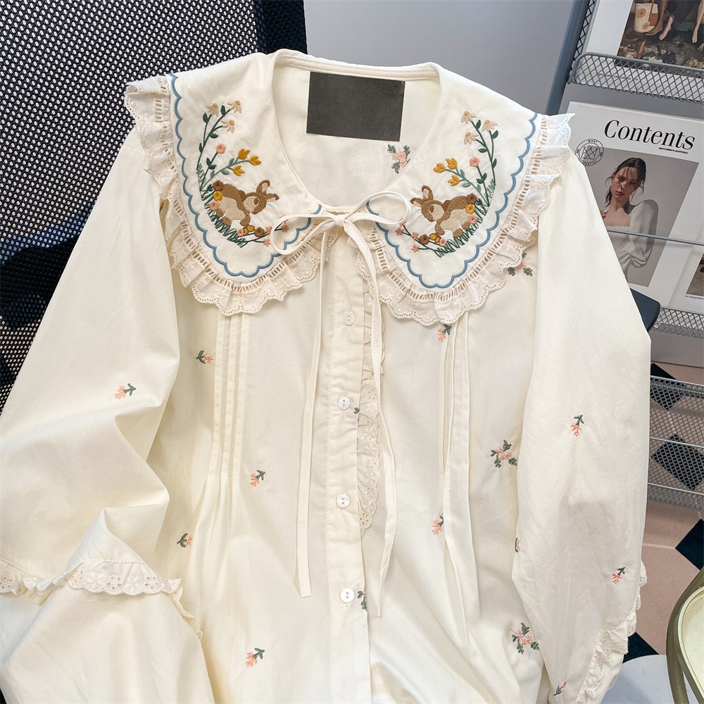 法式独特漂亮碎花刺绣娃娃领衬衫女秋冬洋派甜美内搭叠穿长袖上衣