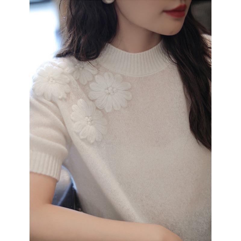 冰丝短袖t恤女2025新款夏季设计感小众宽松显瘦白色绣花针织上衣