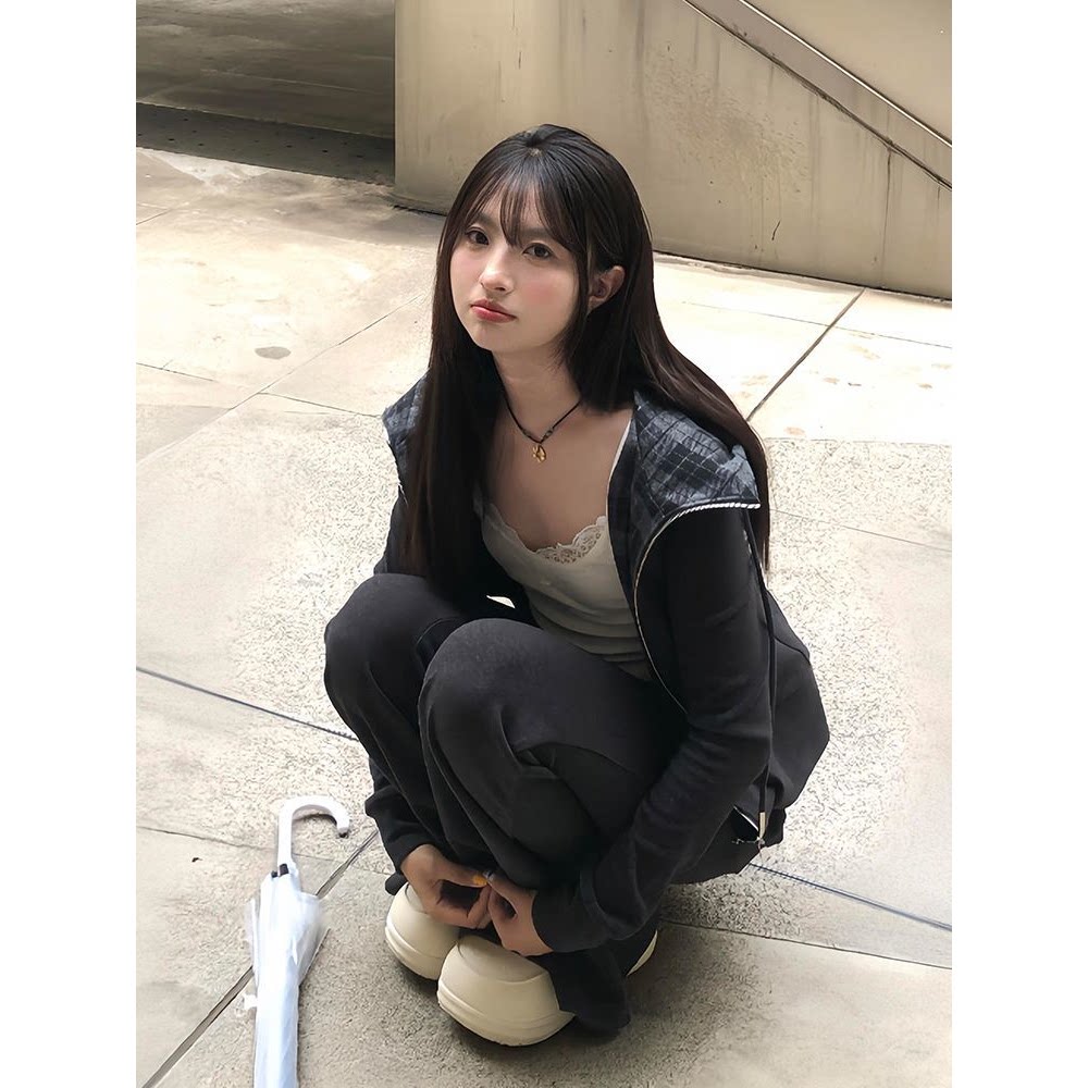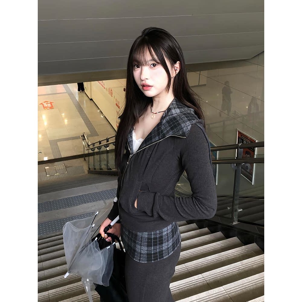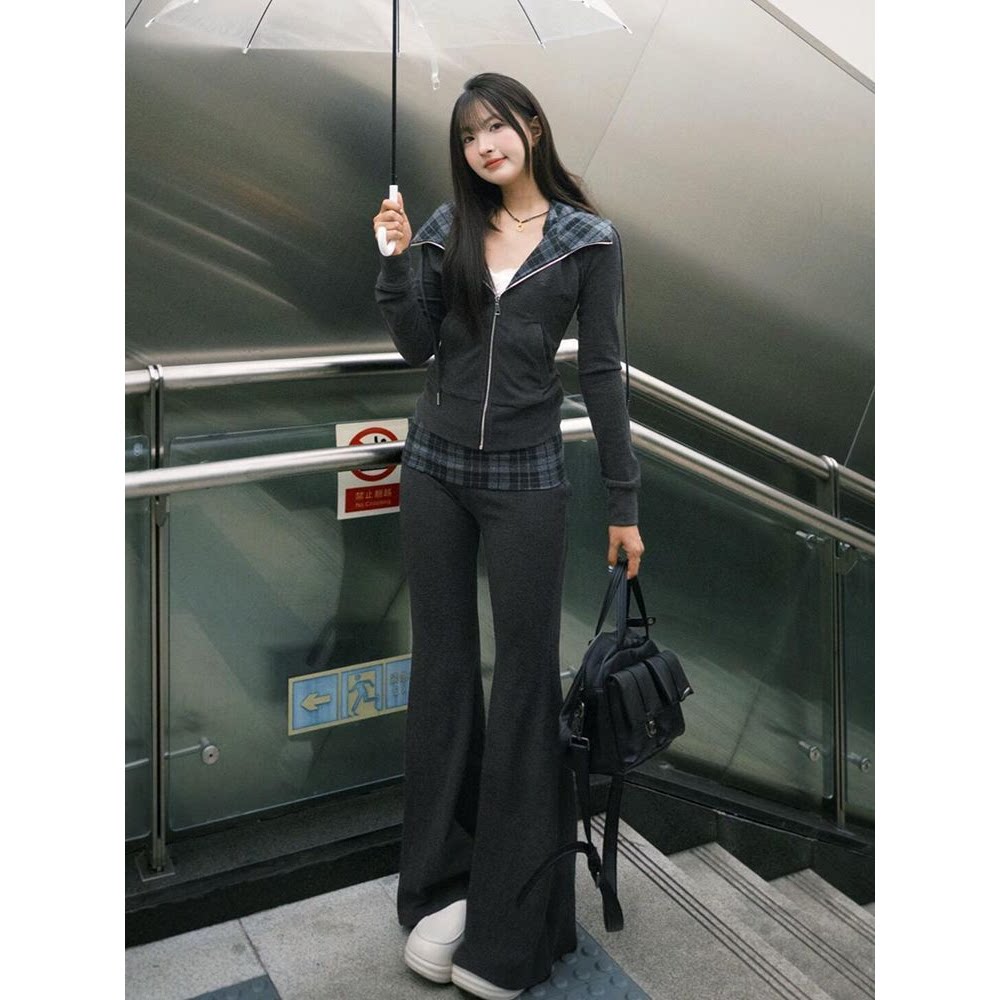 2025秋季新款美式复古气质修身格纹长袖连帽卫衣+高腰喇叭裤套装