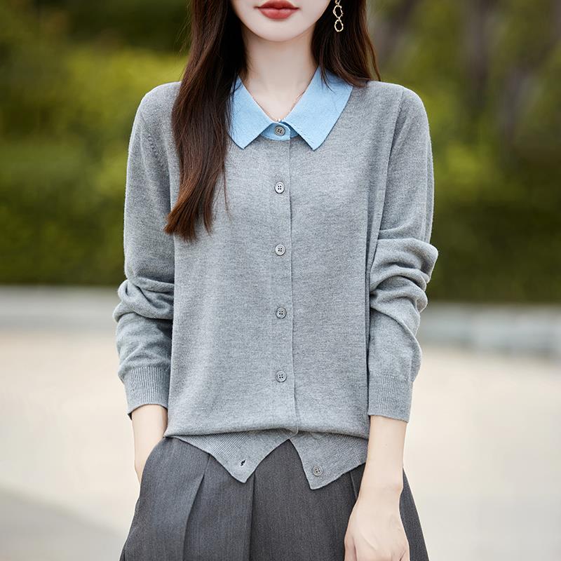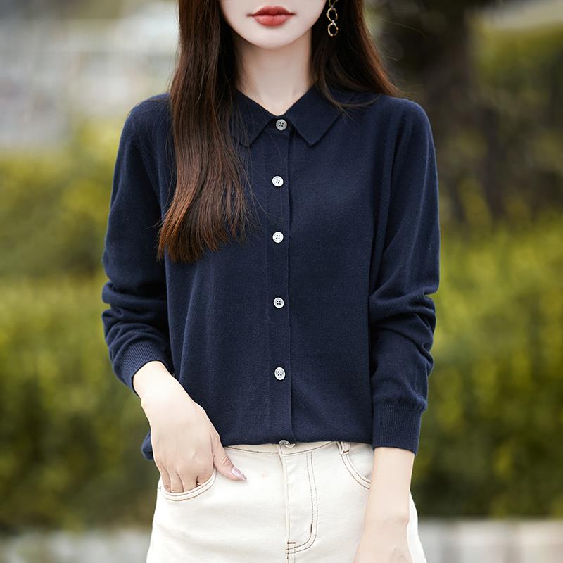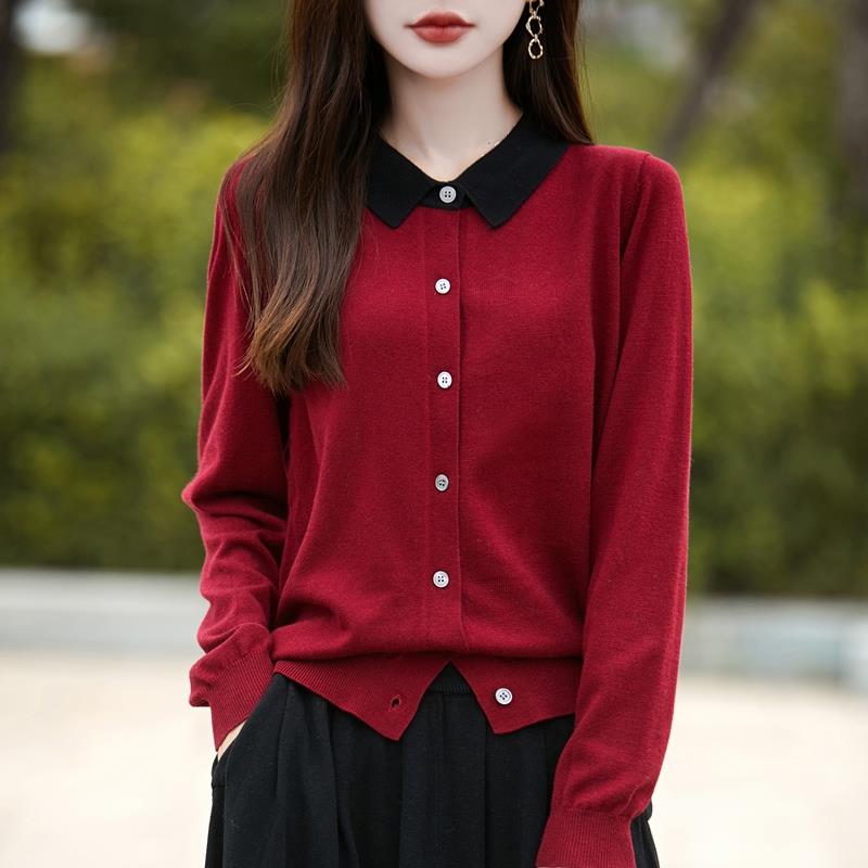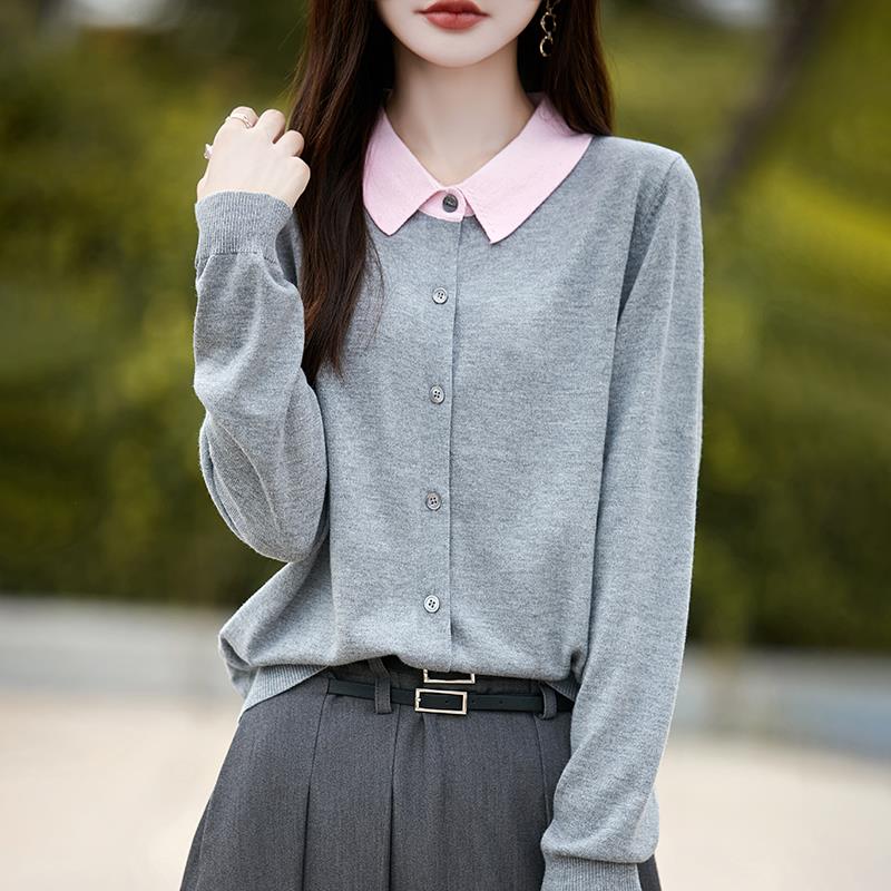 法式polo领针织开衫女长袖翻领衬衫拼色打底上衣2025新款精纺毛衫