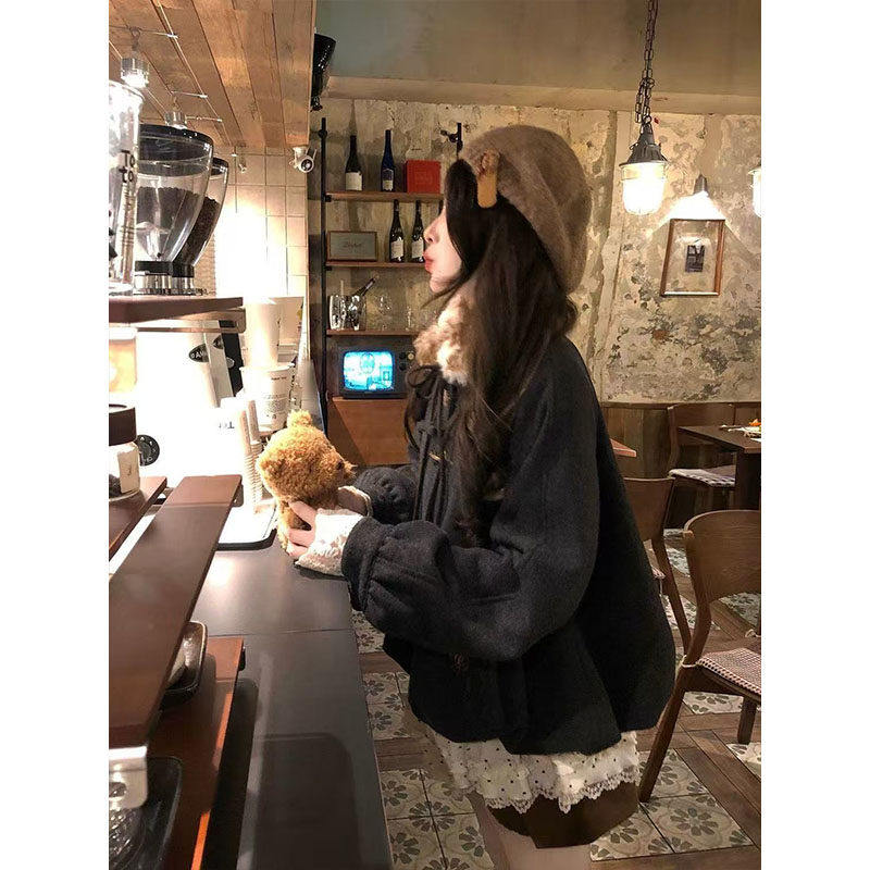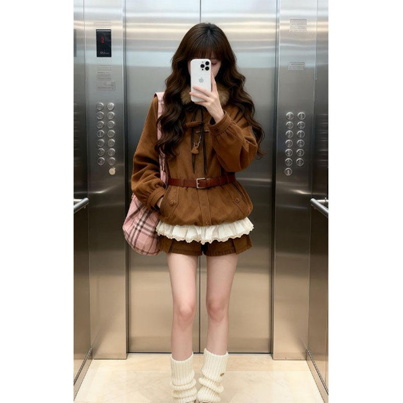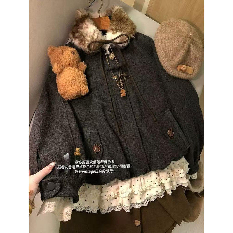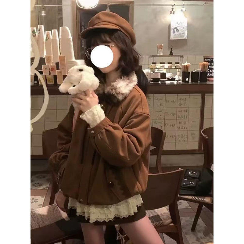 美拉德蝴蝶结毛领鹿皮绒棉服女冬季夹棉保暖vintage宽松花苞外套