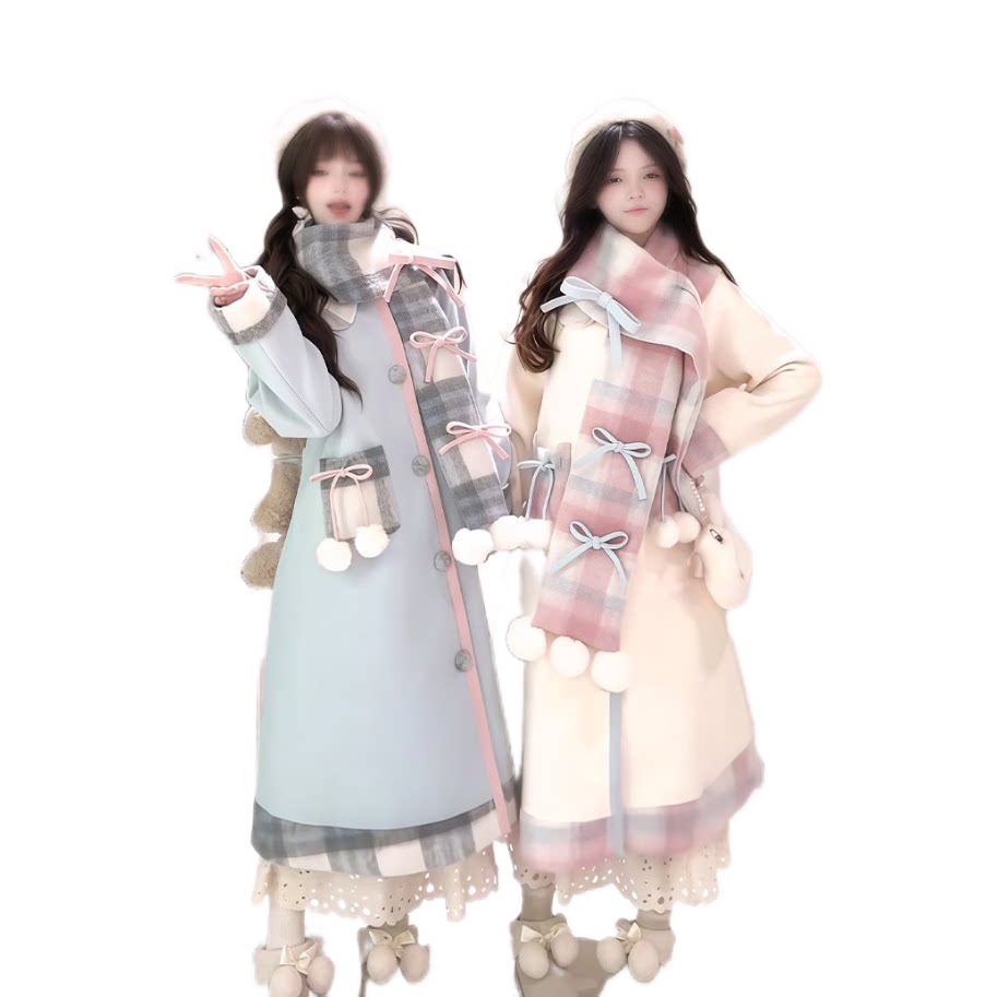 【奶油日记】2025年秋冬可爱蝴蝶结格子甜美少女围巾毛呢长款大衣