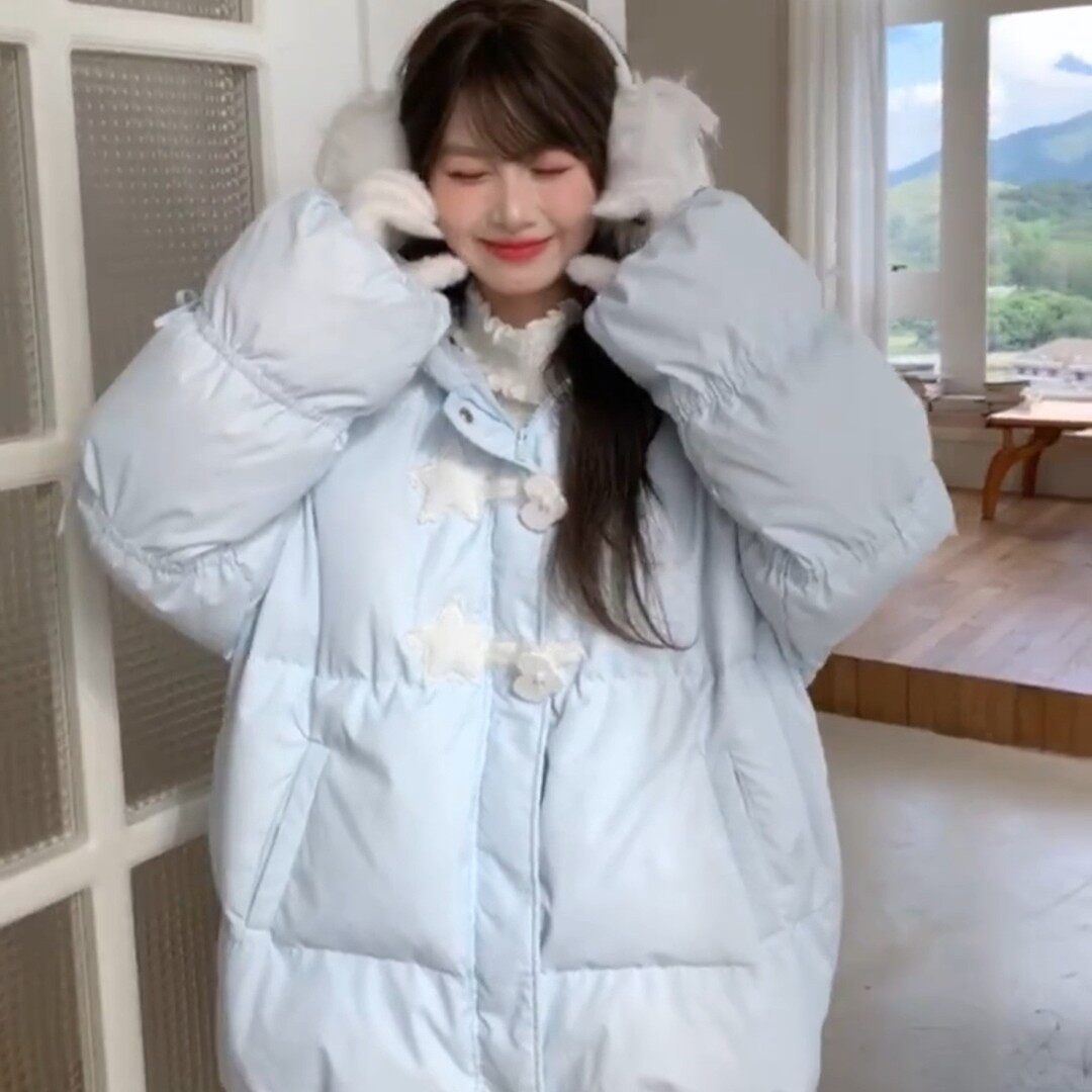 蓝色星星毛领连帽棉服外套女2025冬季新款加厚不臃肿宽松保暖棉袄