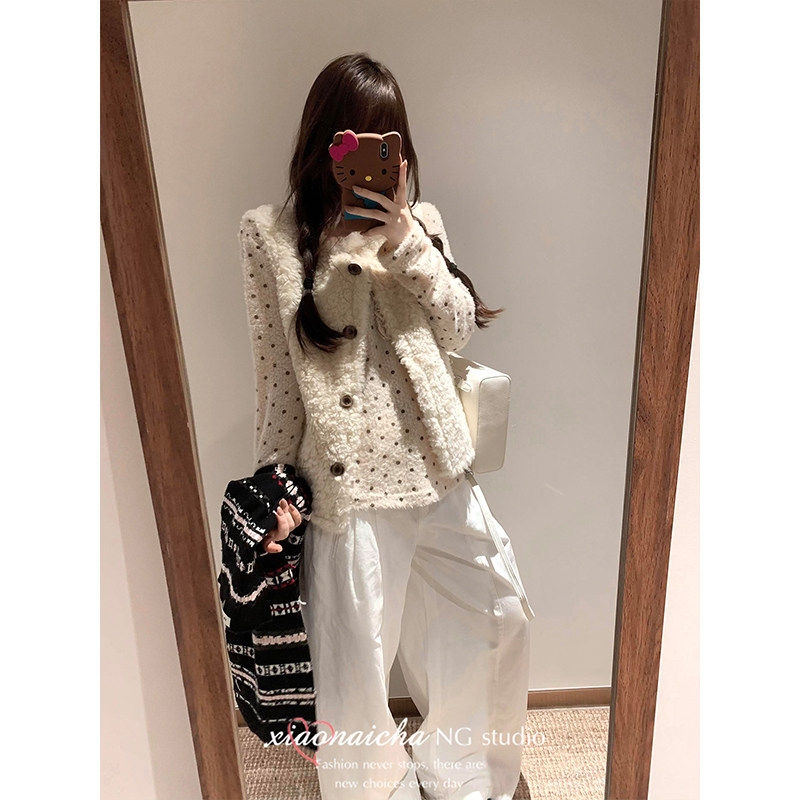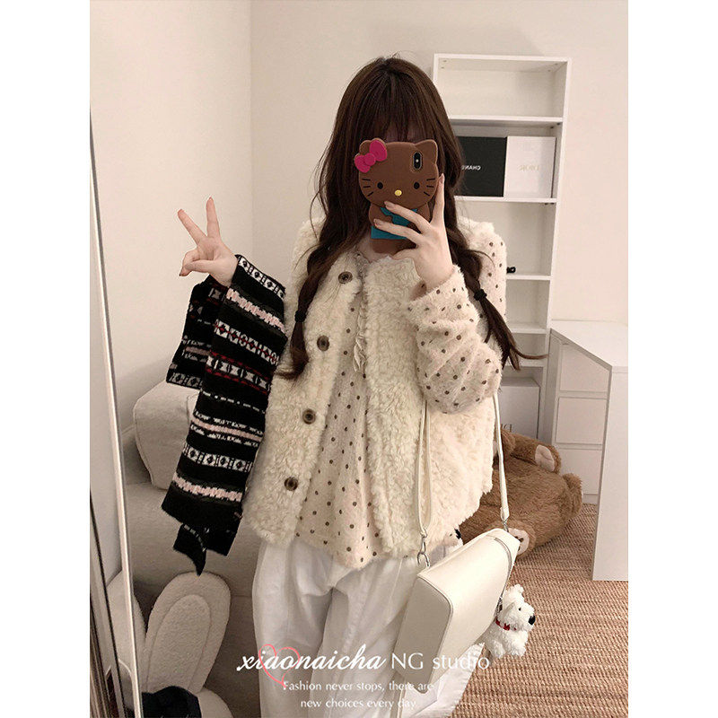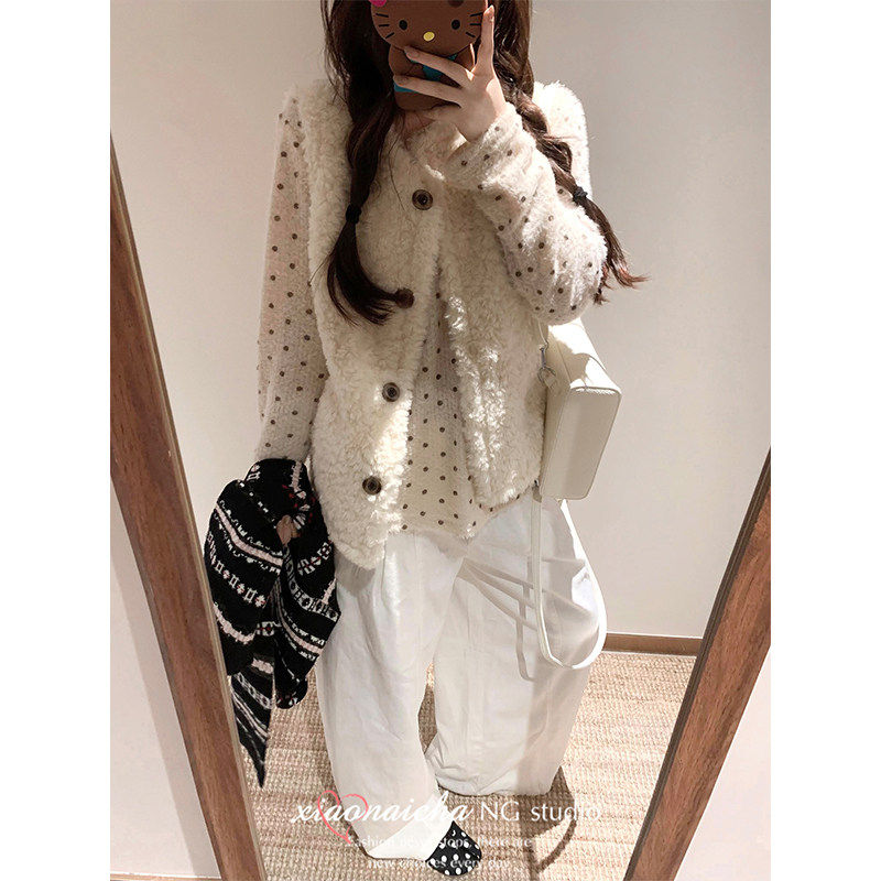 日系复古羊羔毛马甲外套女秋冬小个子穿搭叠穿针织衫上衣两件套装