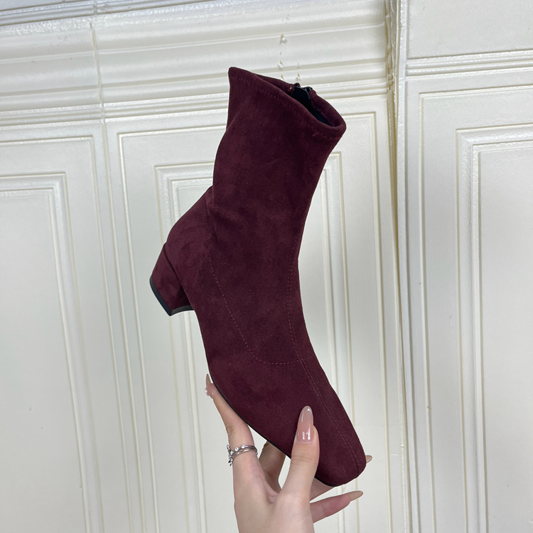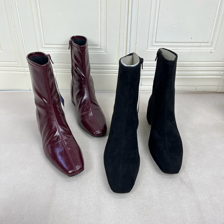 外贸原单女靴新款时尚方头纯色粗跟侧拉链时装短靴百搭通勤瘦瘦靴