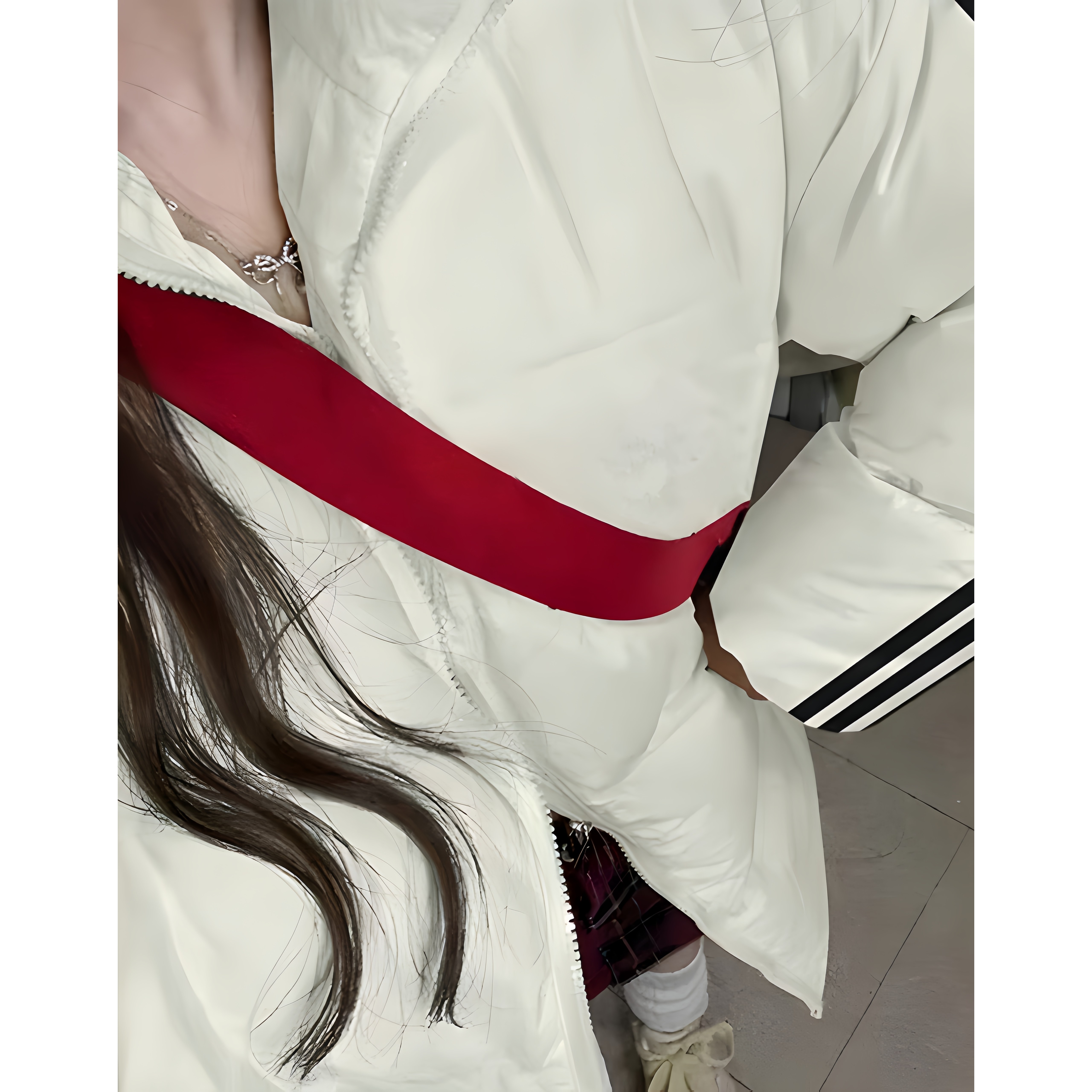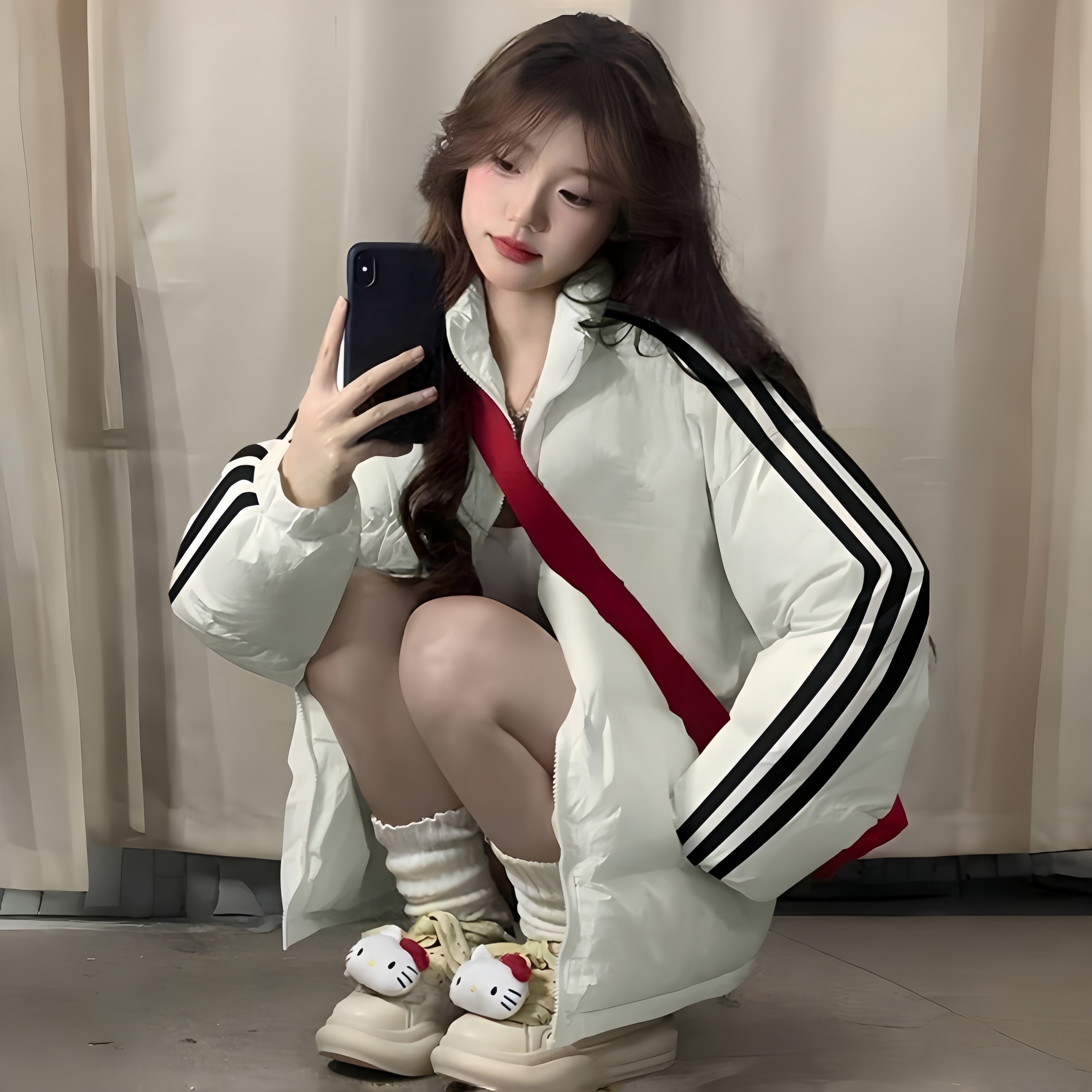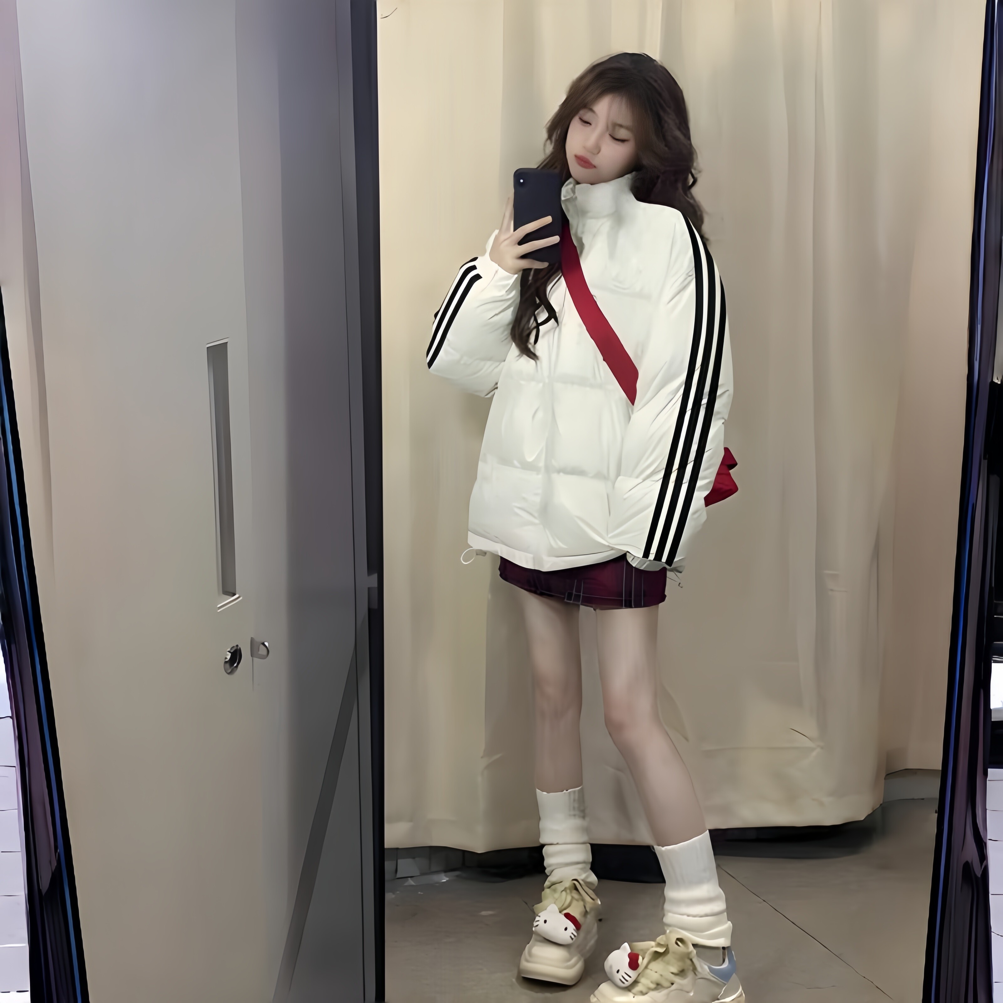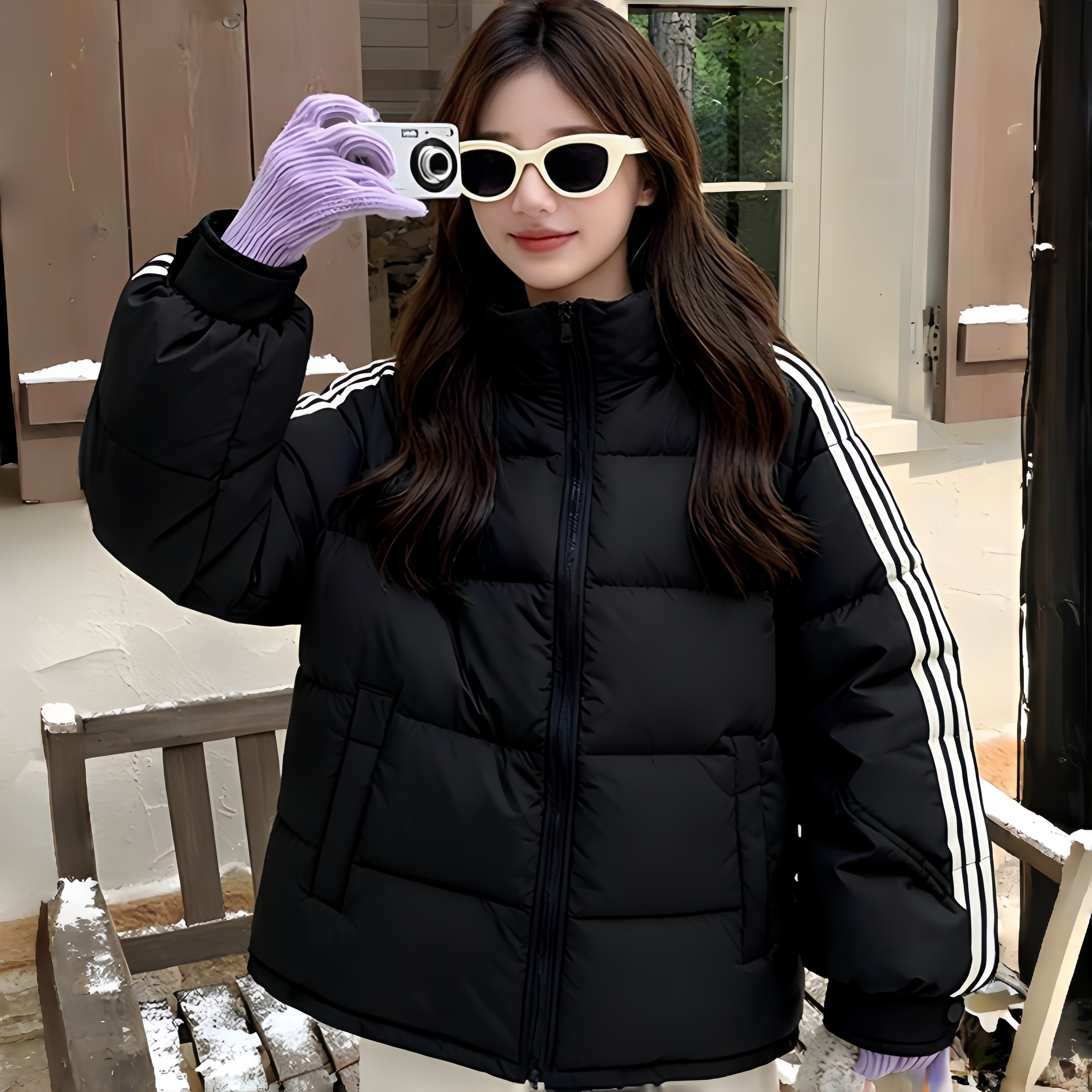 加大码胖妹妹羽绒棉服女秋冬新款简约三条杠立领宽松保暖加厚外套