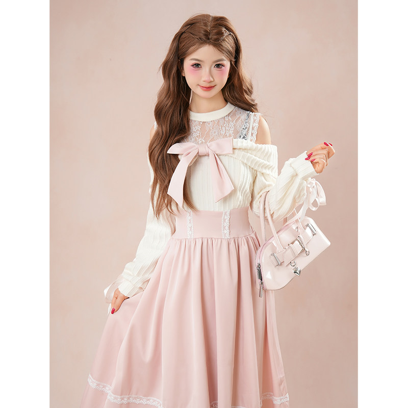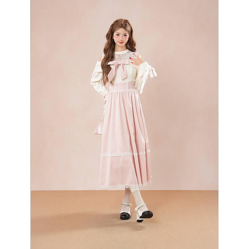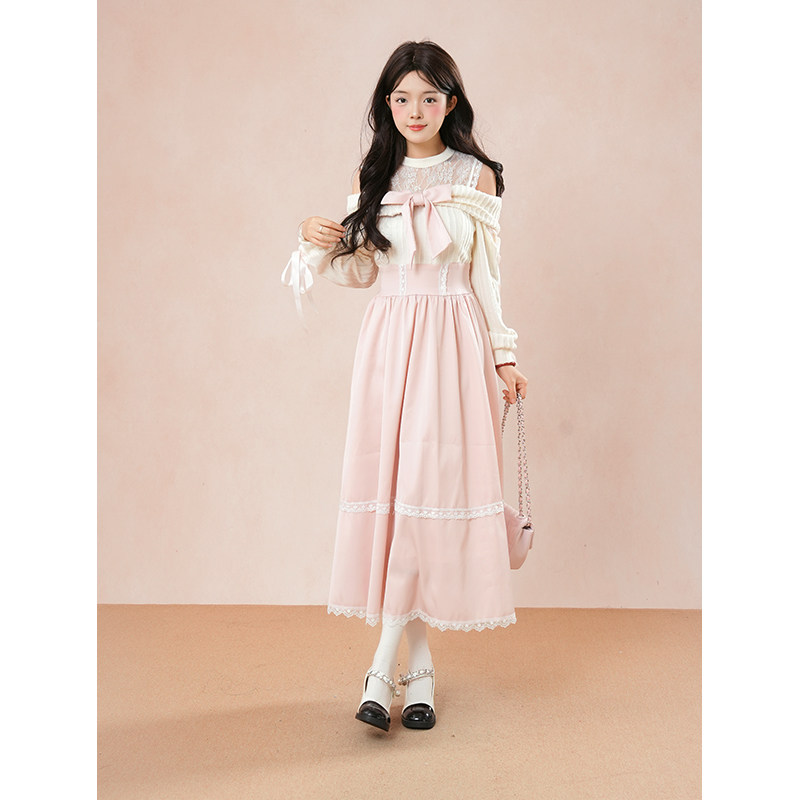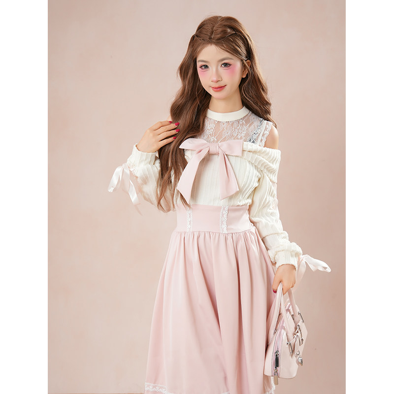 秋日絮语 清楚系优雅温柔浅粉露肩连衣裙女气质修身蕾丝长袖长裙