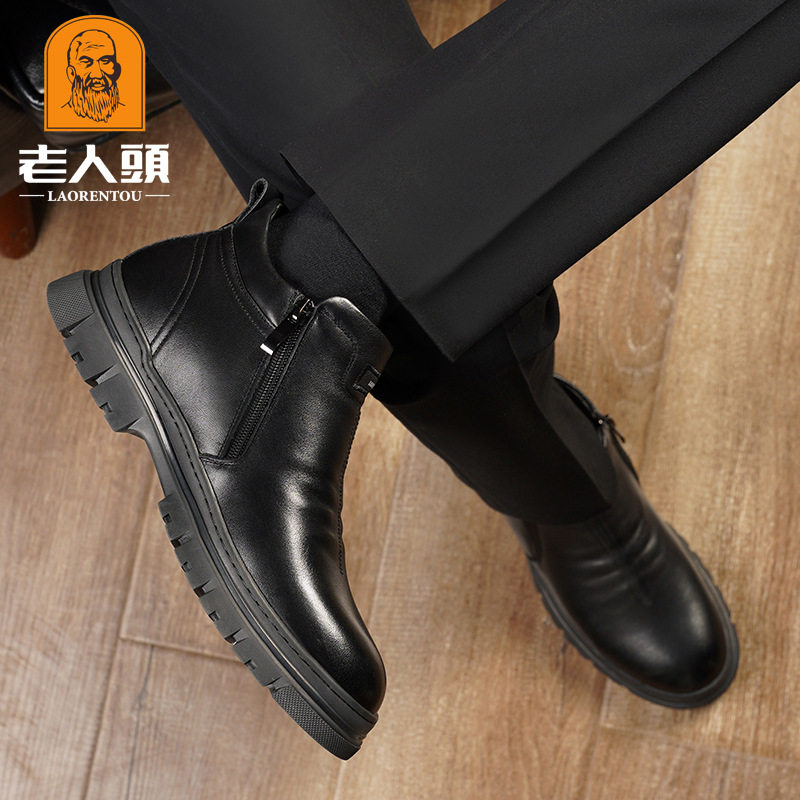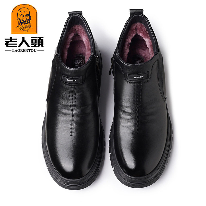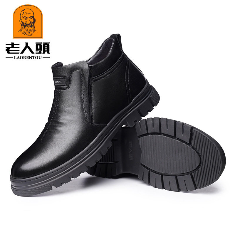 老人头品牌正品羊毛高帮棉鞋男加绒加厚保暖冬季男休闲皮鞋防滑防
