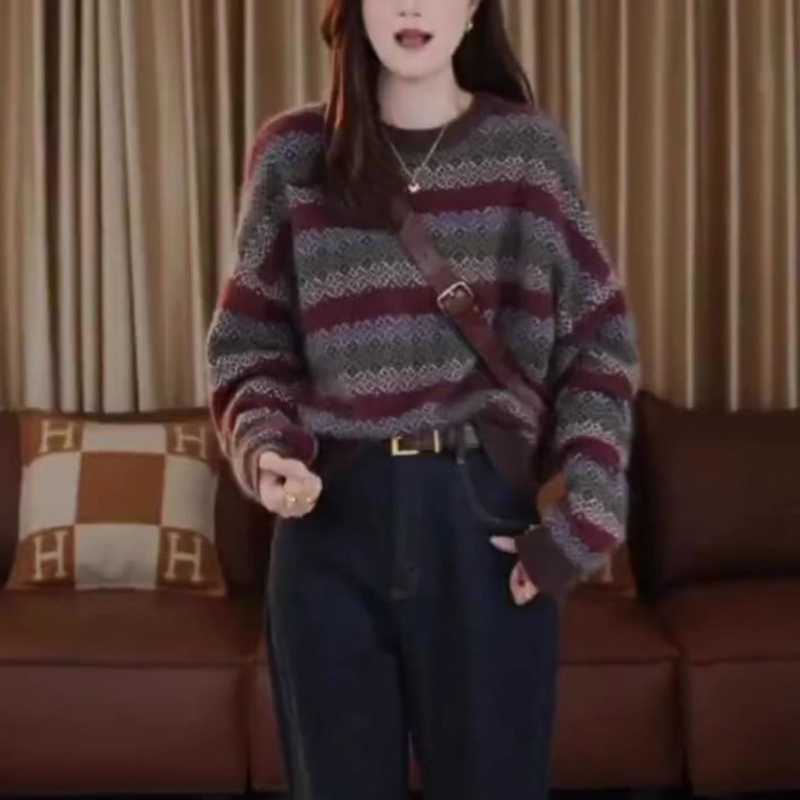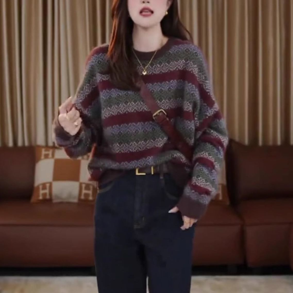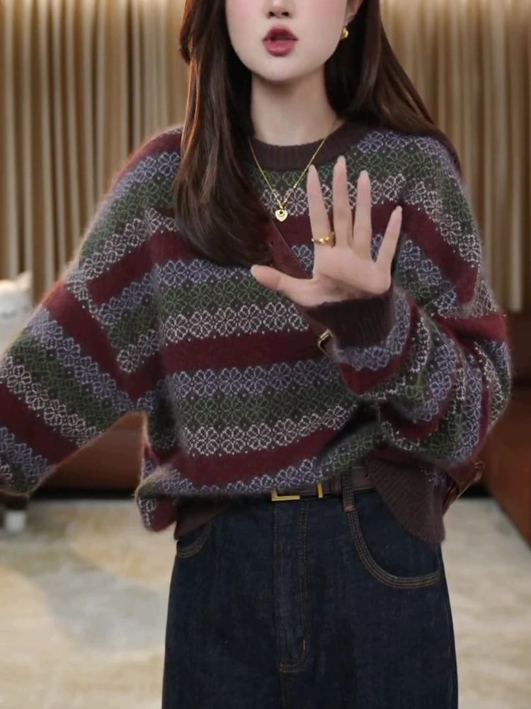 秋冬新款大朗毛衣加厚复古洋气时尚毛衣轻熟圆领长袖针织条纹上衣