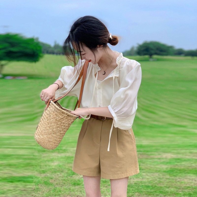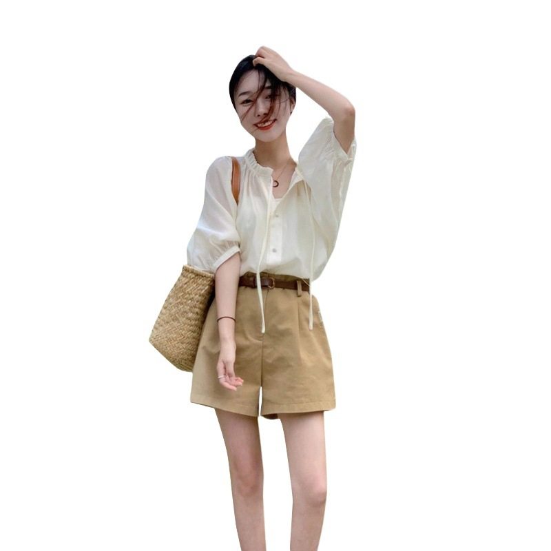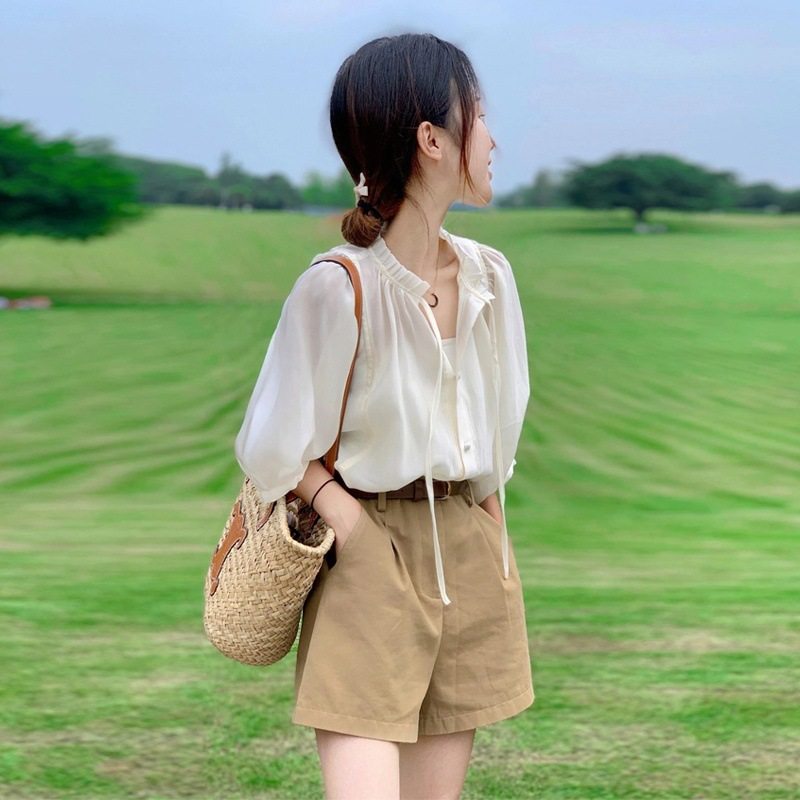 2024年新款早春季法式短袖衬衫高级感雪纺上衣衬衣女装夏装两件套