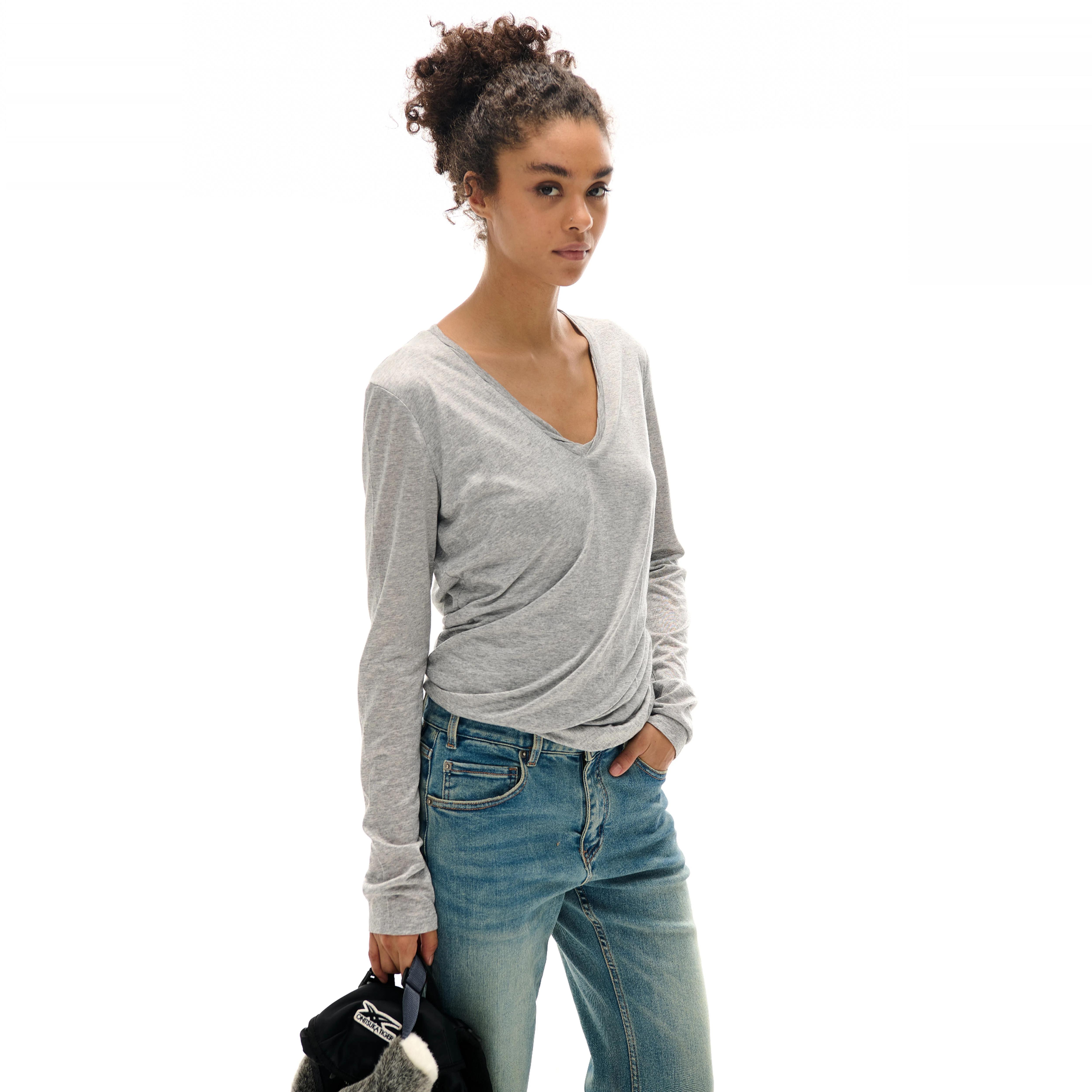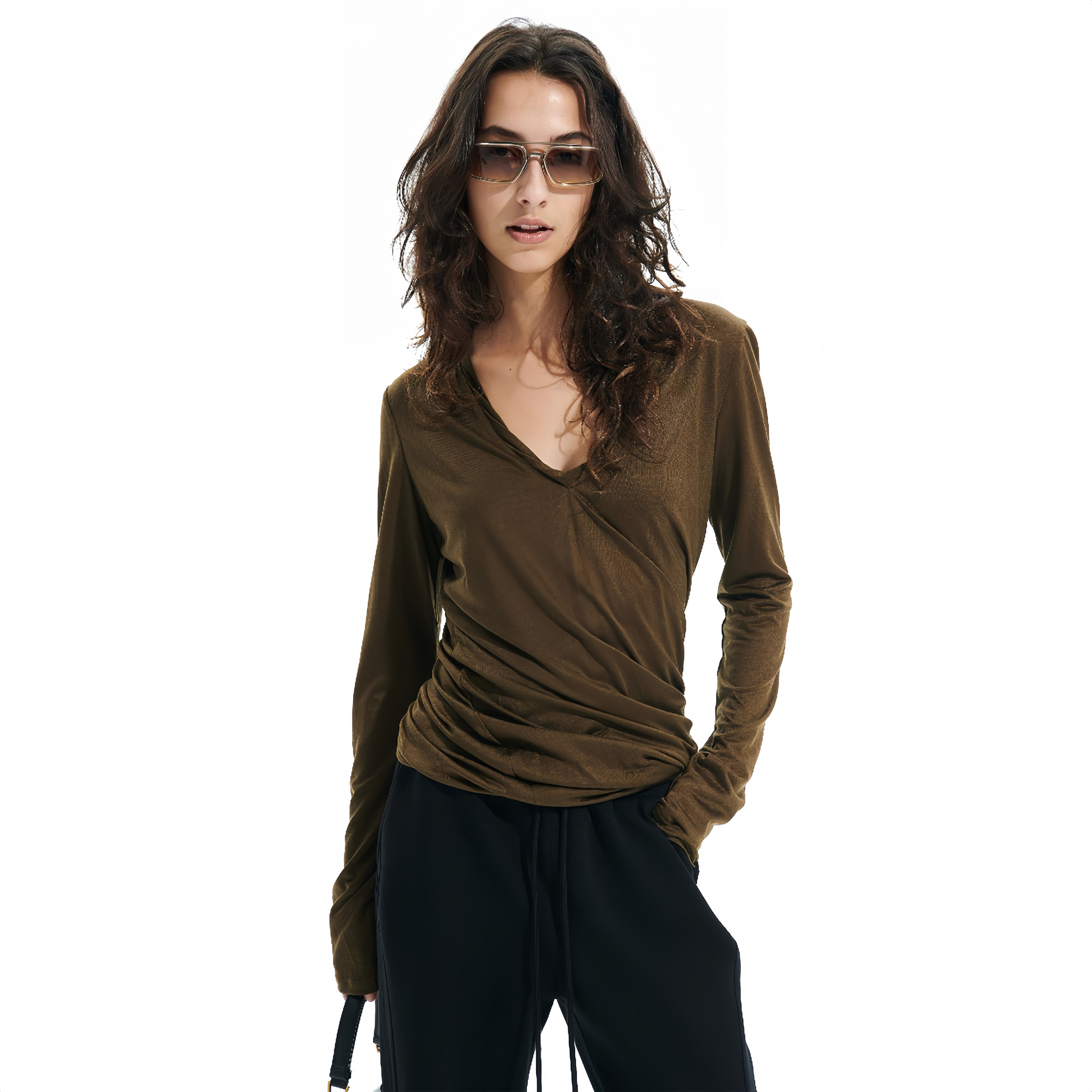 Two little guys* 24秋冬V领堆积感褶皱双层天丝长袖T恤