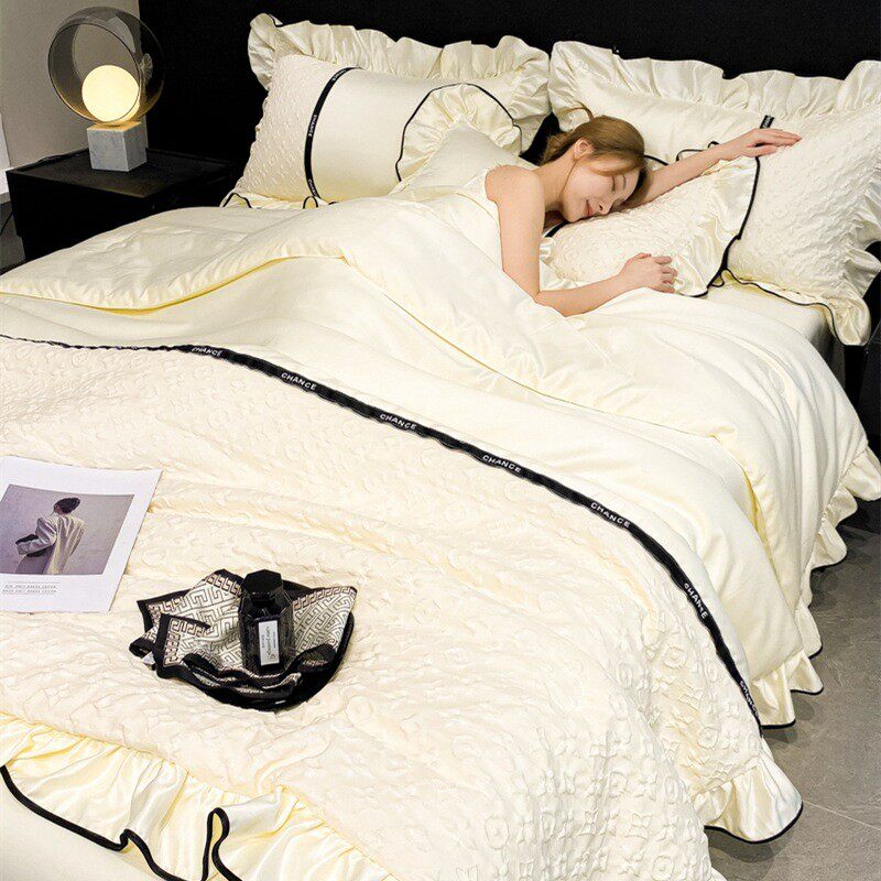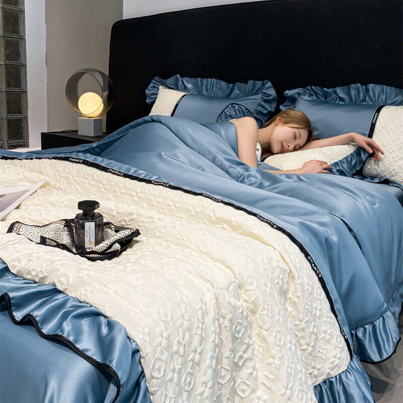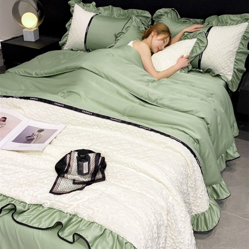 冰丝花边浮雕夏被四件套床上用品轻奢高端丝滑可裸睡空调被四件套