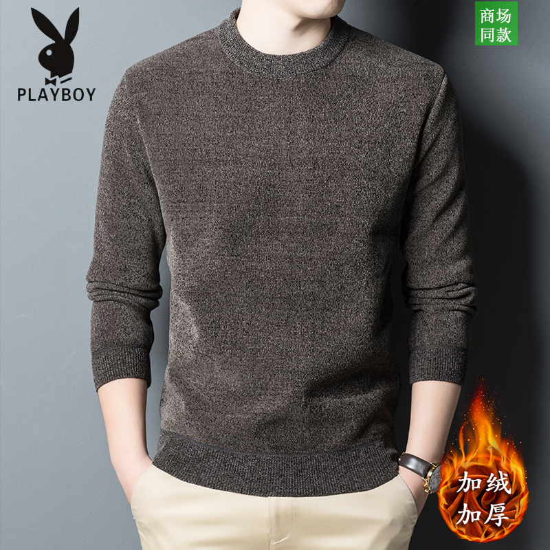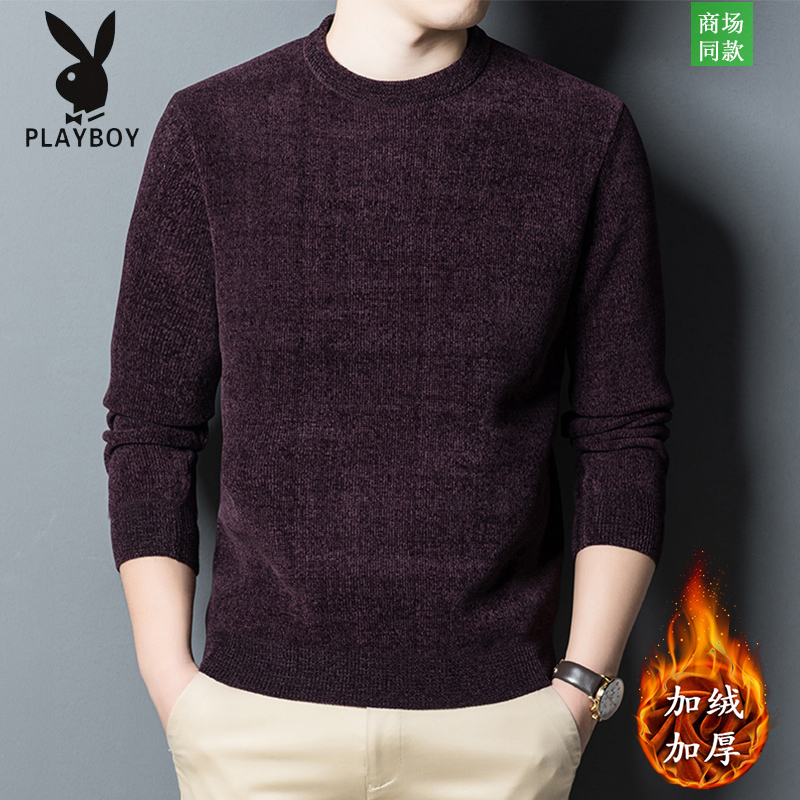 花花公子雪尼尔毛衣男加绒加厚保暖中老年冬季羊毛衫青年圆领潮流