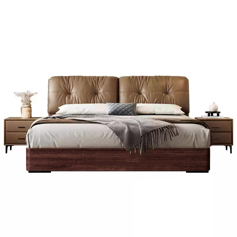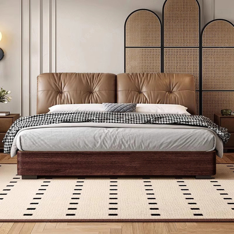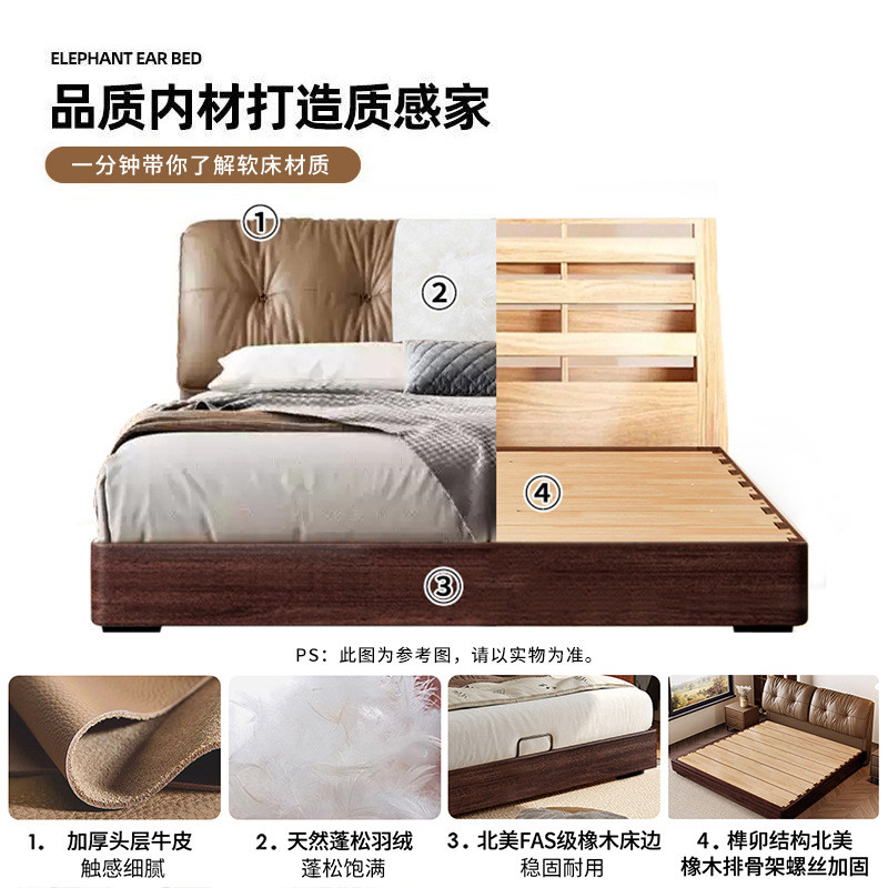 复古中古风橡木实木主卧双人床佛山家具头层牛皮软包1米8真皮大床
