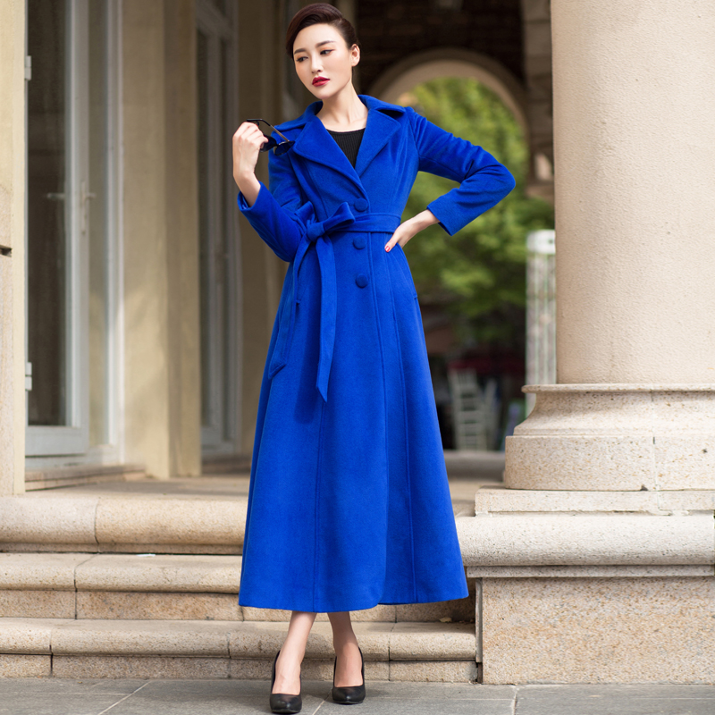 2025冬新款气质修身复古宝蓝色加厚呢子外套羊绒大衣女超长款过膝