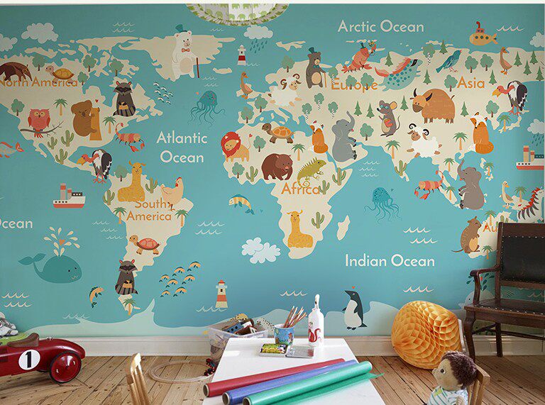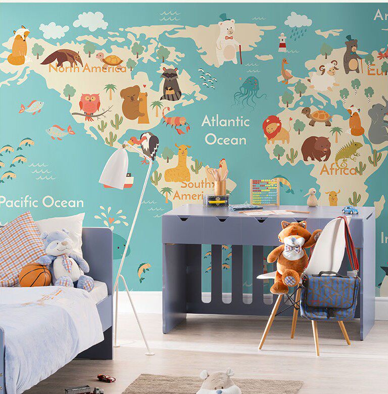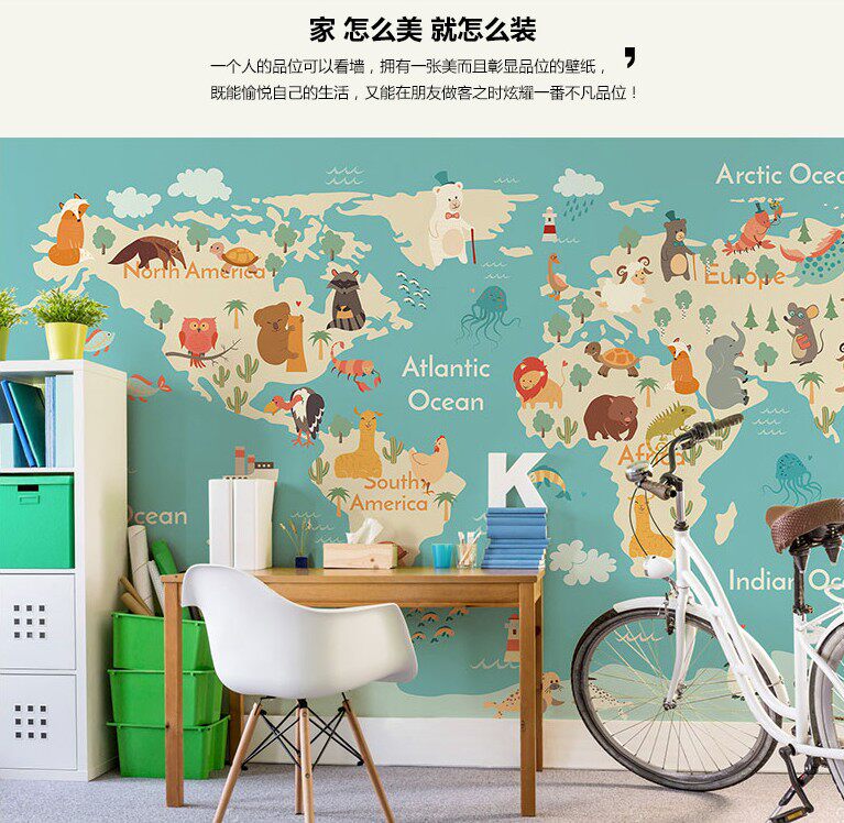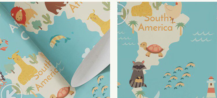 兰蔻手绘卡通世界地图壁纸儿童房墙布卧室背景墙纸男孩定制壁纸画