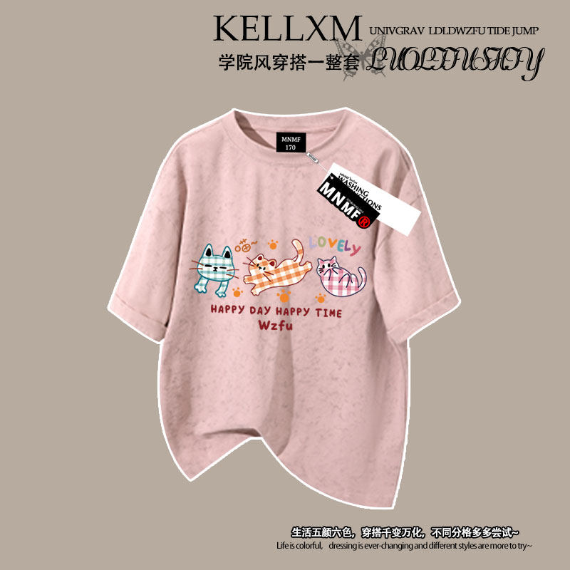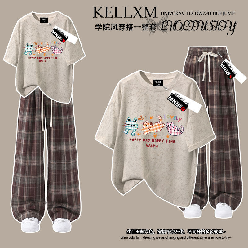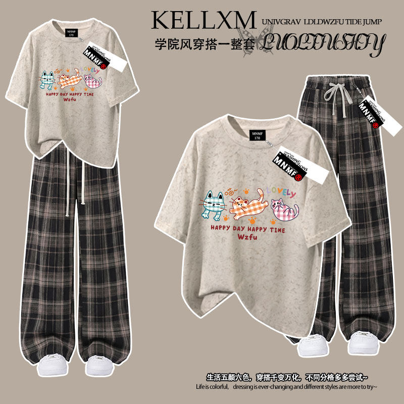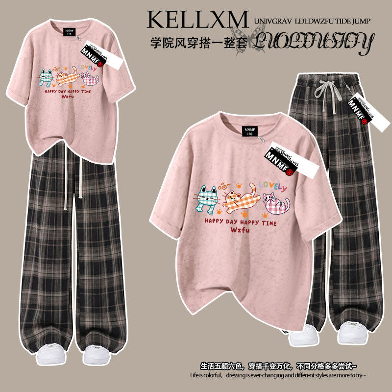 夏季款100%纯棉女童三只猫印花扎染短袖T恤格子长裤套装学院风ins
