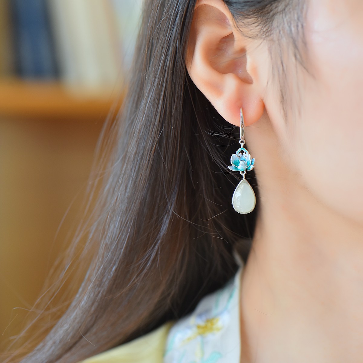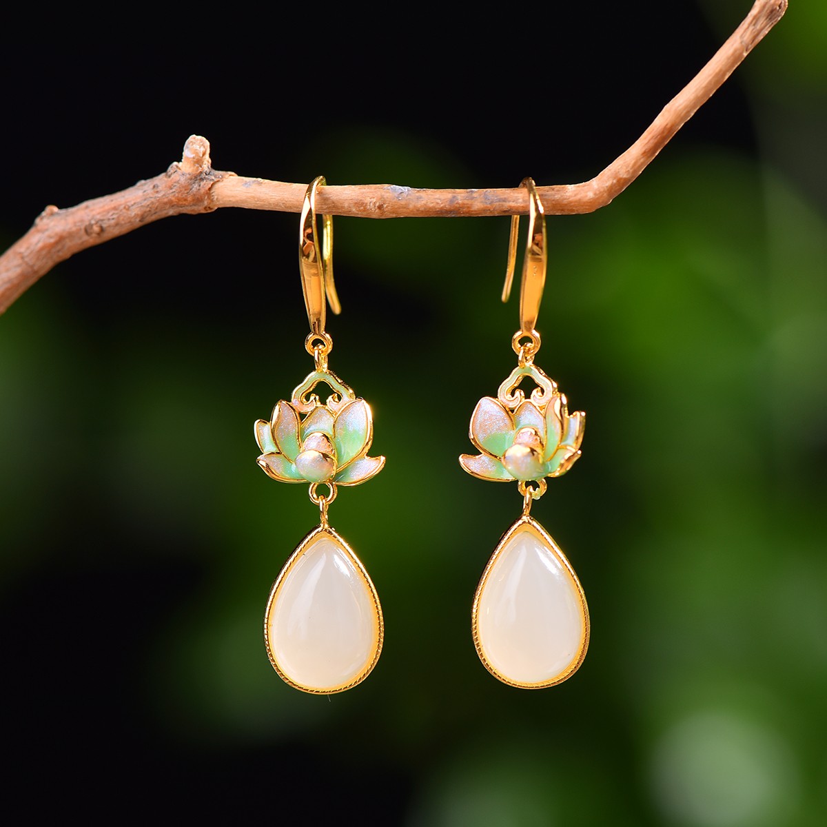 天然和田玉白玉925银镶嵌珐琅彩莲花水滴玉石耳坠耳环耳饰