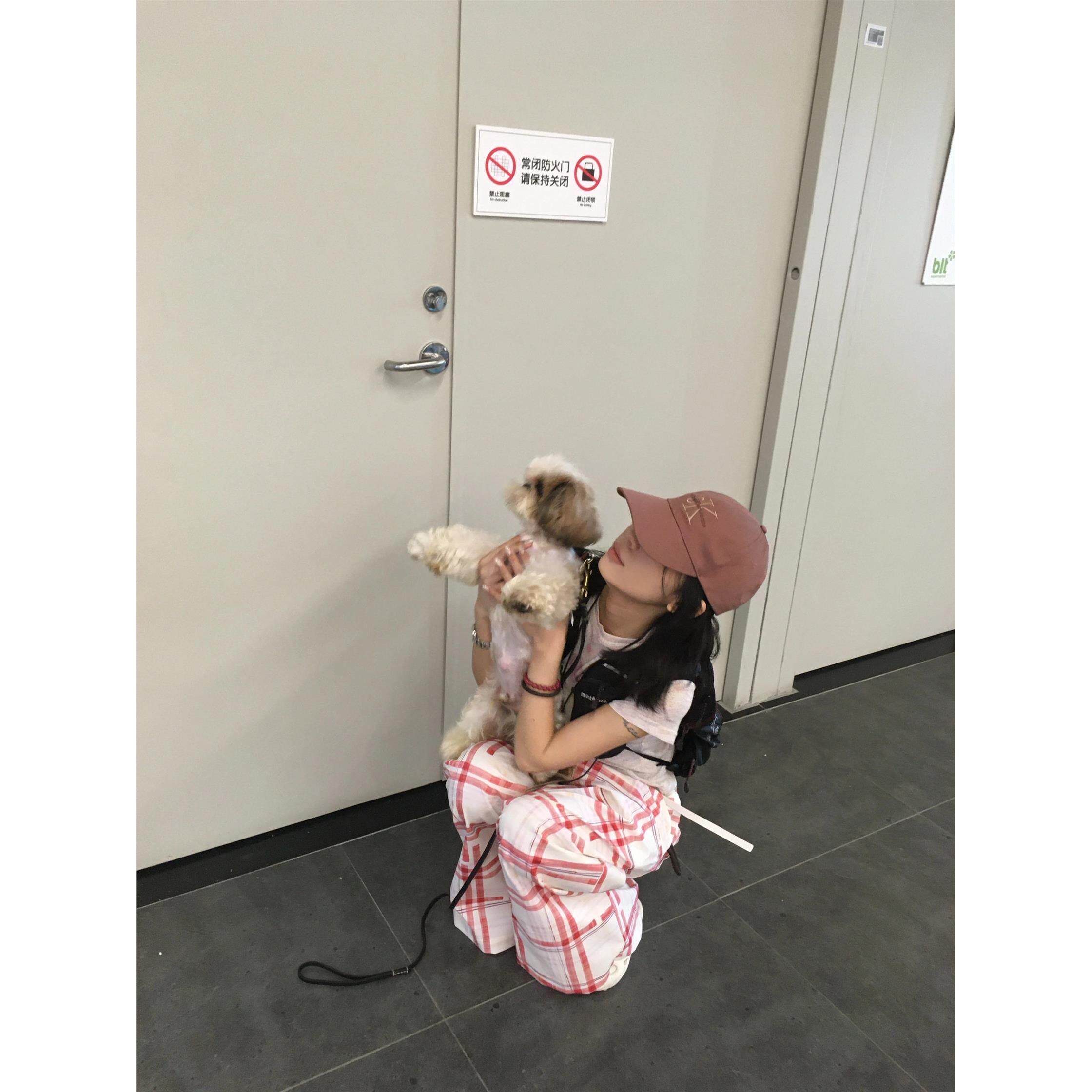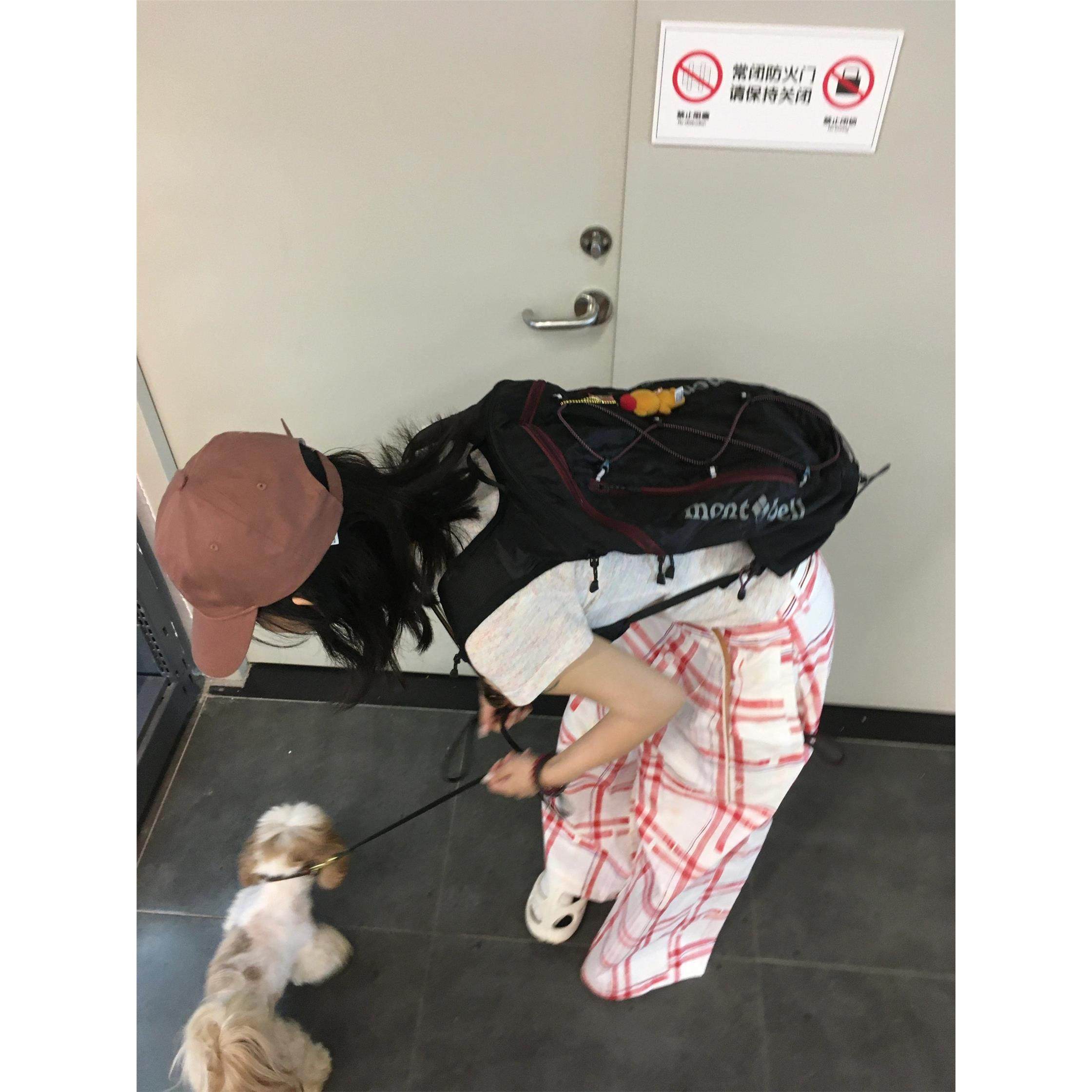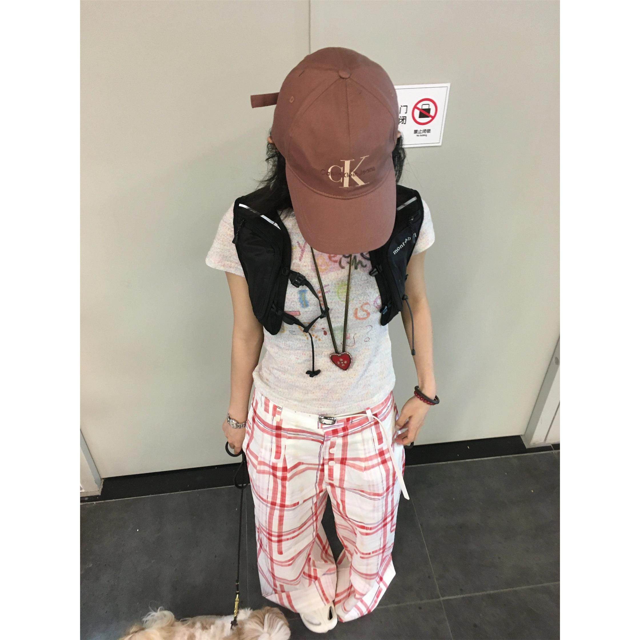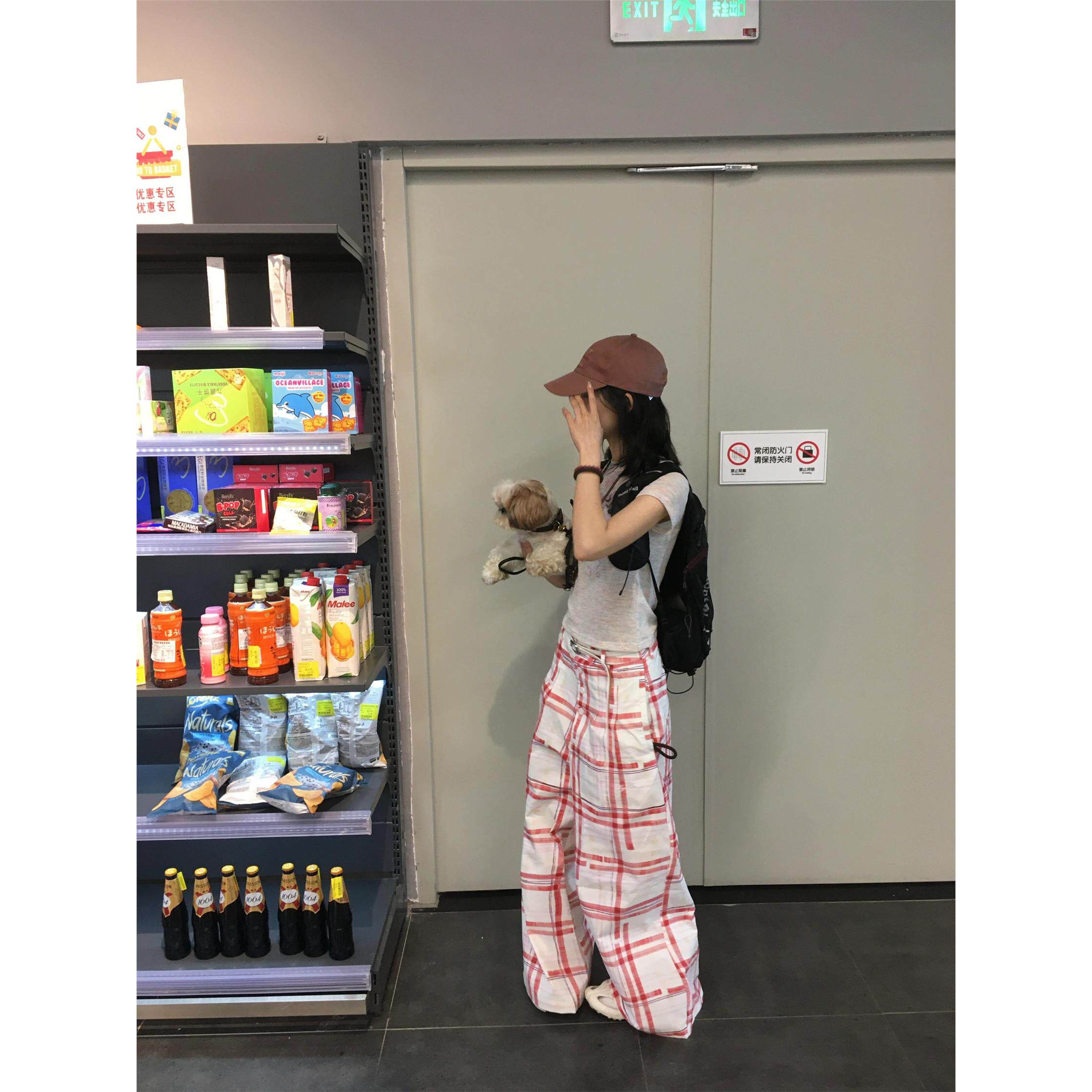 美式覆古红白格纹阔腿裤女秋季街头小众慵懒松弛感休闲条纹拖地裤