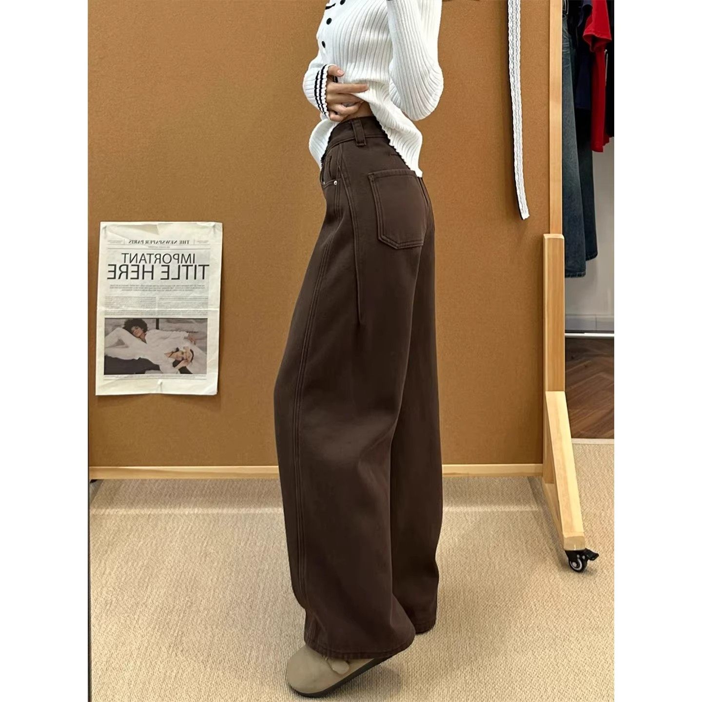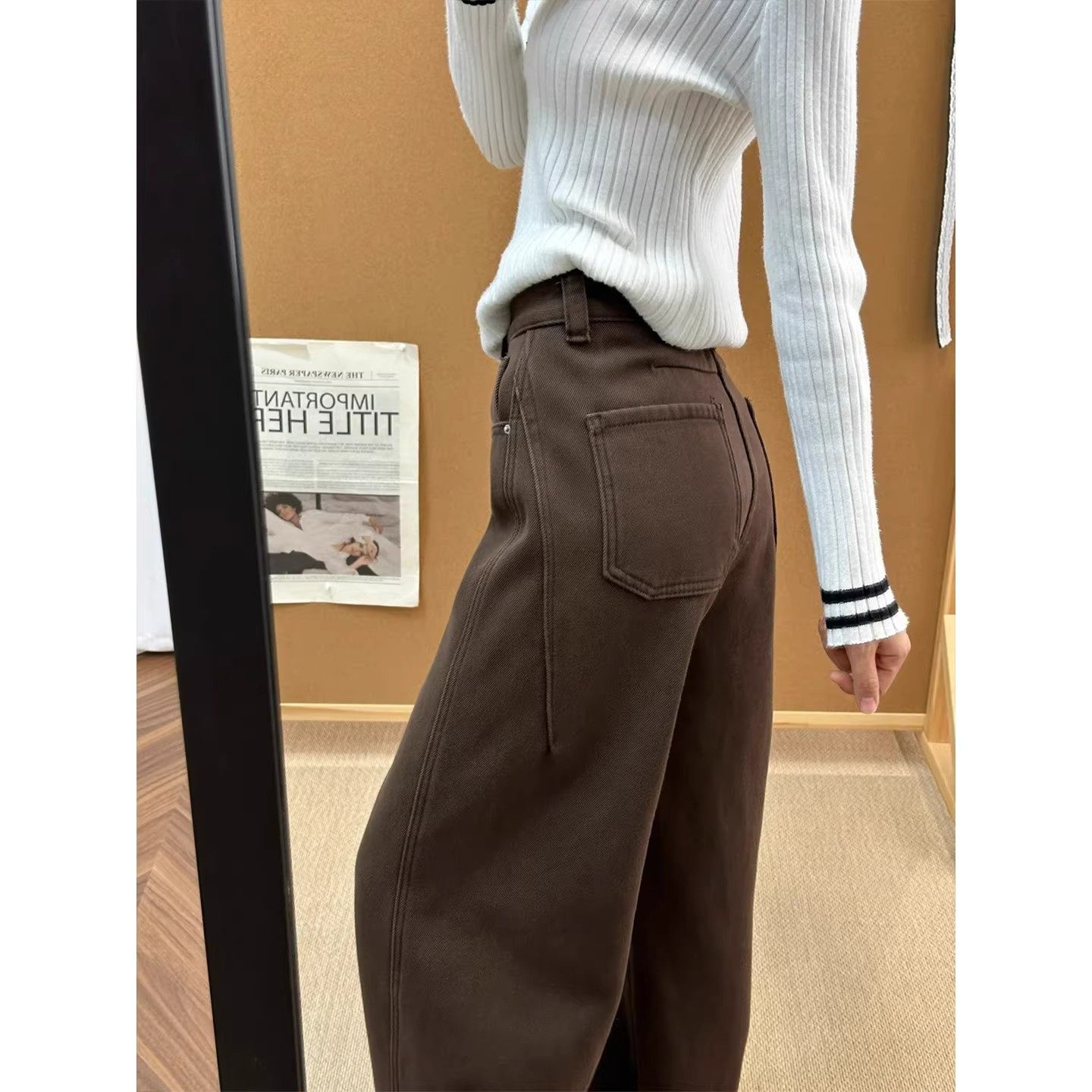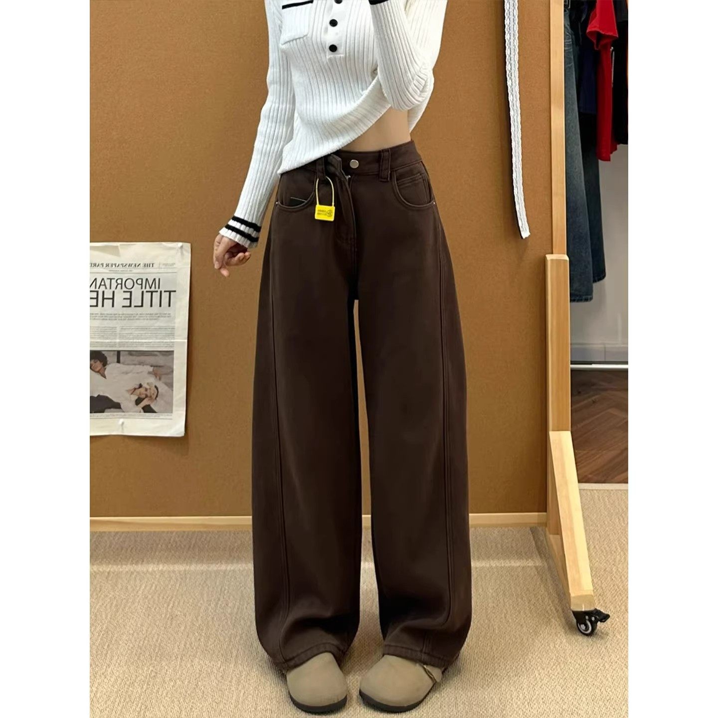 圣保维丽棕色裤子冬胖mm大码加绒加厚牛仔裤阔腿裤咖色弯刀长裤女