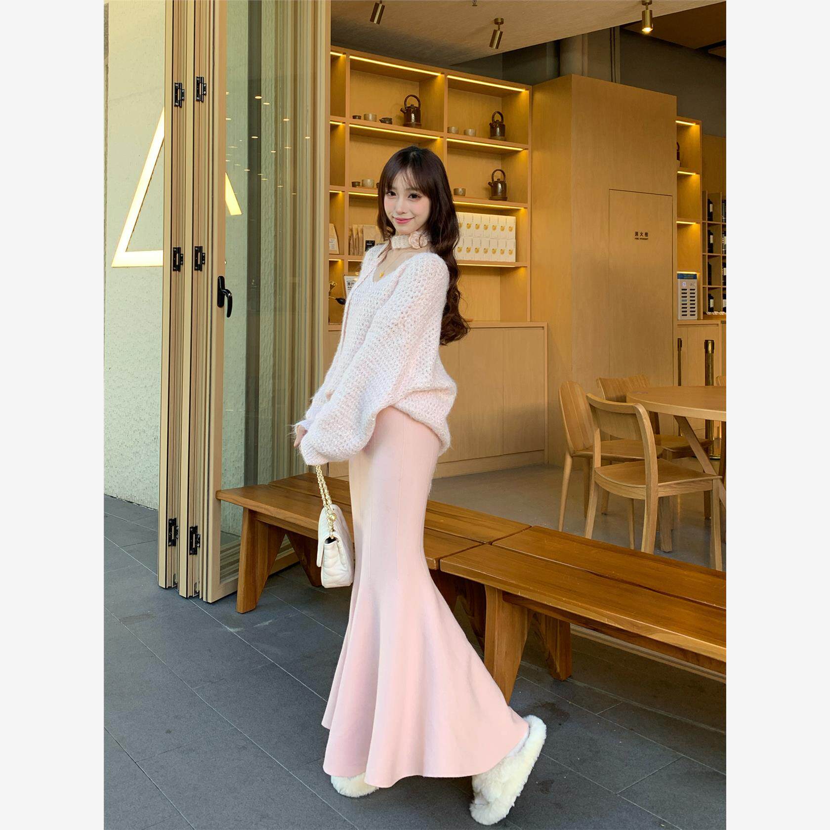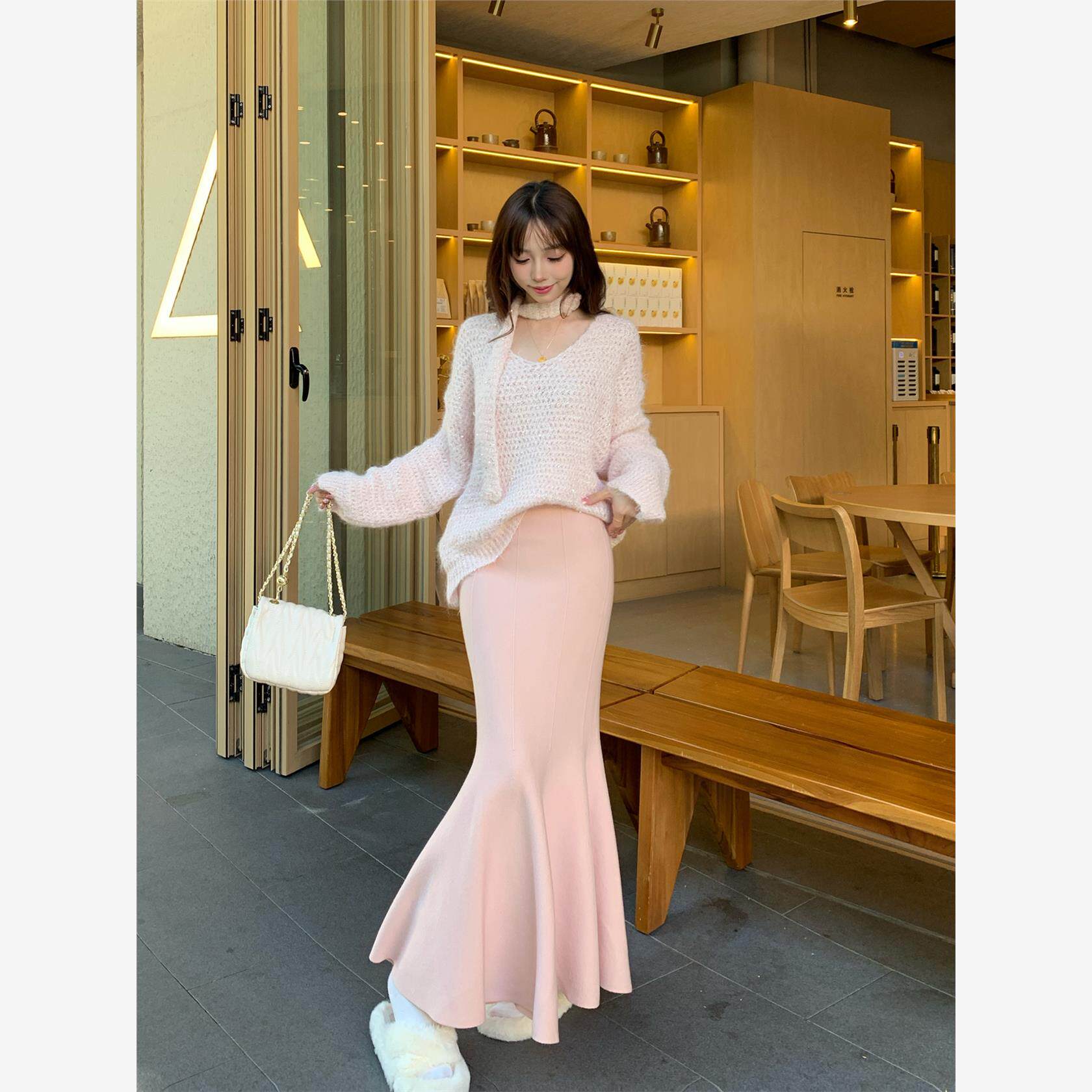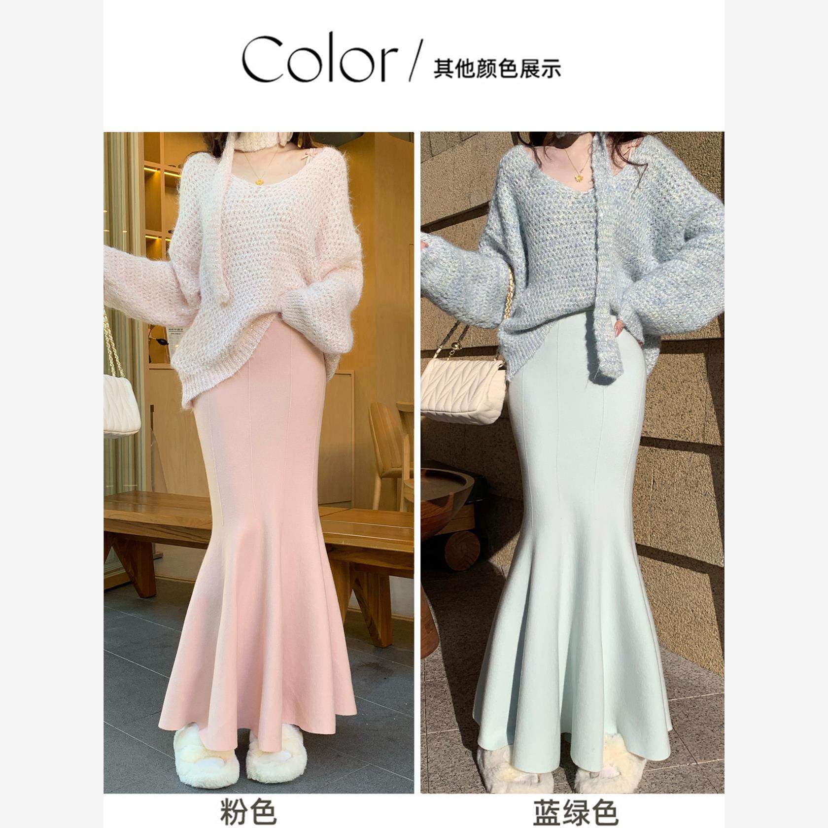 漂亮独特针织鱼尾裙女冬季高个子加长韩系温柔粉色修身包臀半身裙