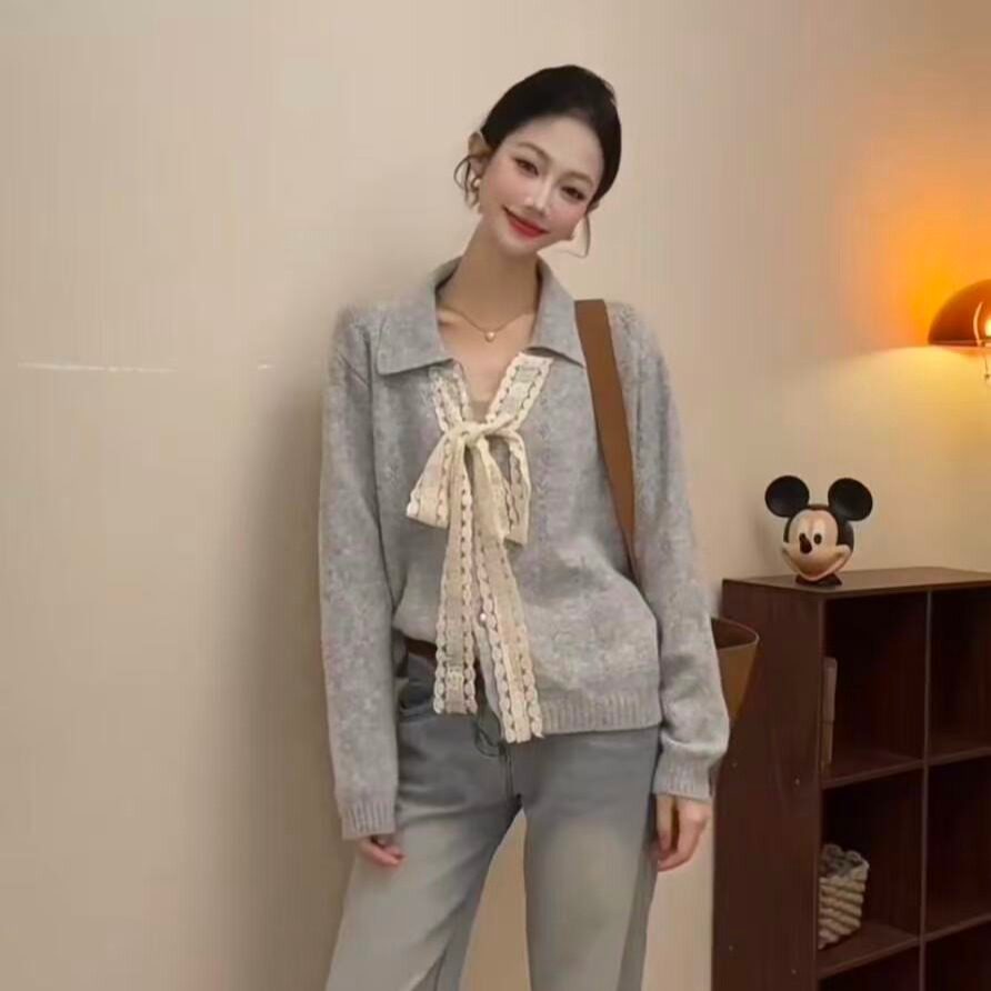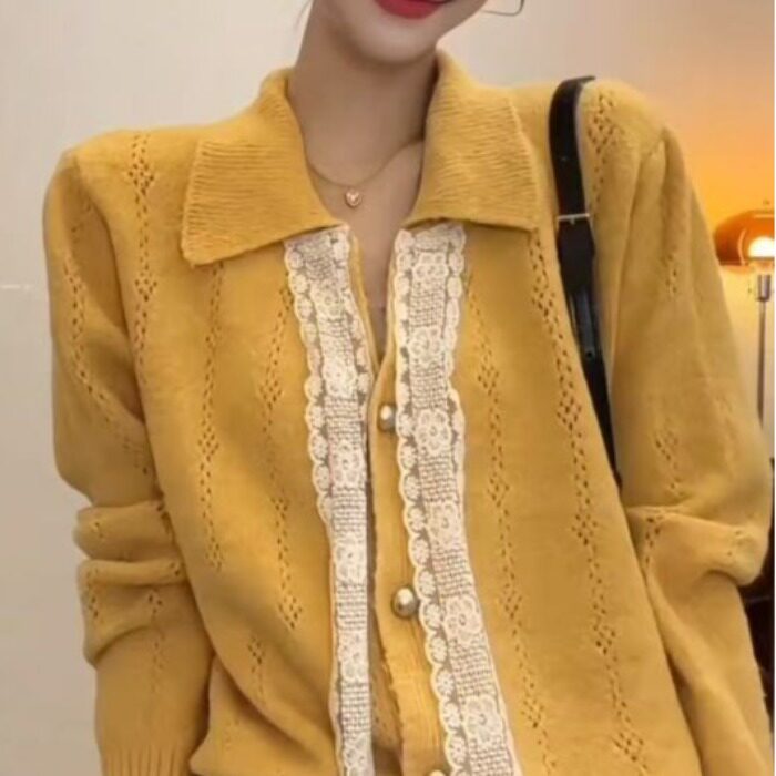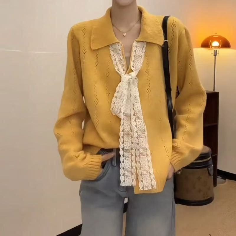 韩系氛围感早秋上衣女2025新款法式独特黄色小香风蕾丝系带针织衫
