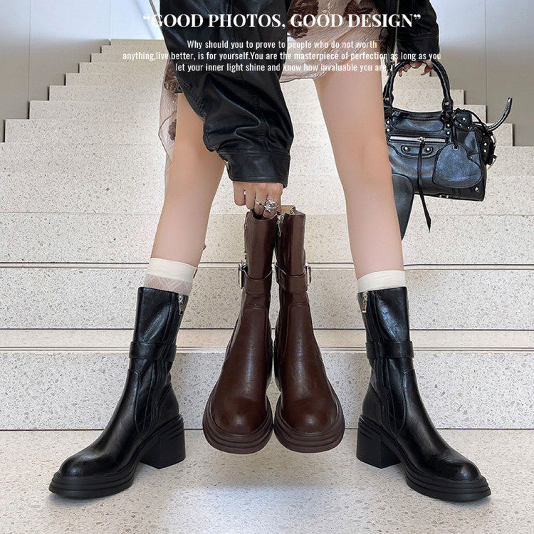 潮流皮带扣侧拉链粗跟骑士靴女2025秋冬新圆头气质高跟弹力中筒靴