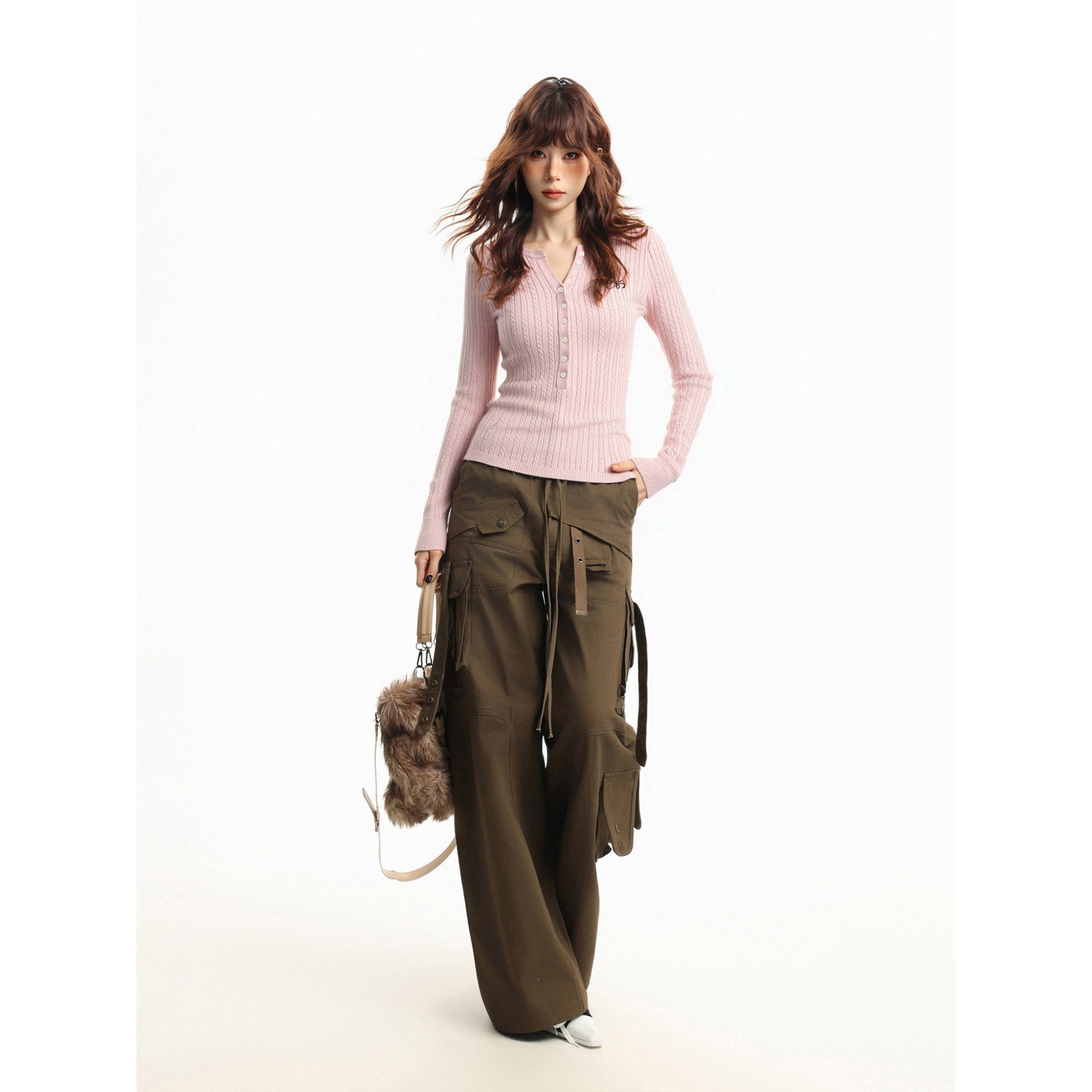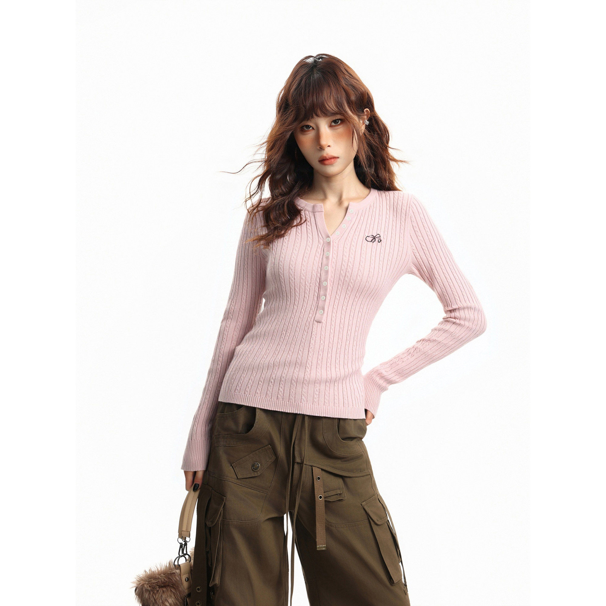 美式粉色正肩v领长袖针织衫女秋冬修身显瘦气质内搭打底毛衣上衣