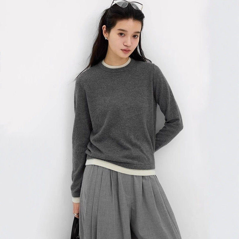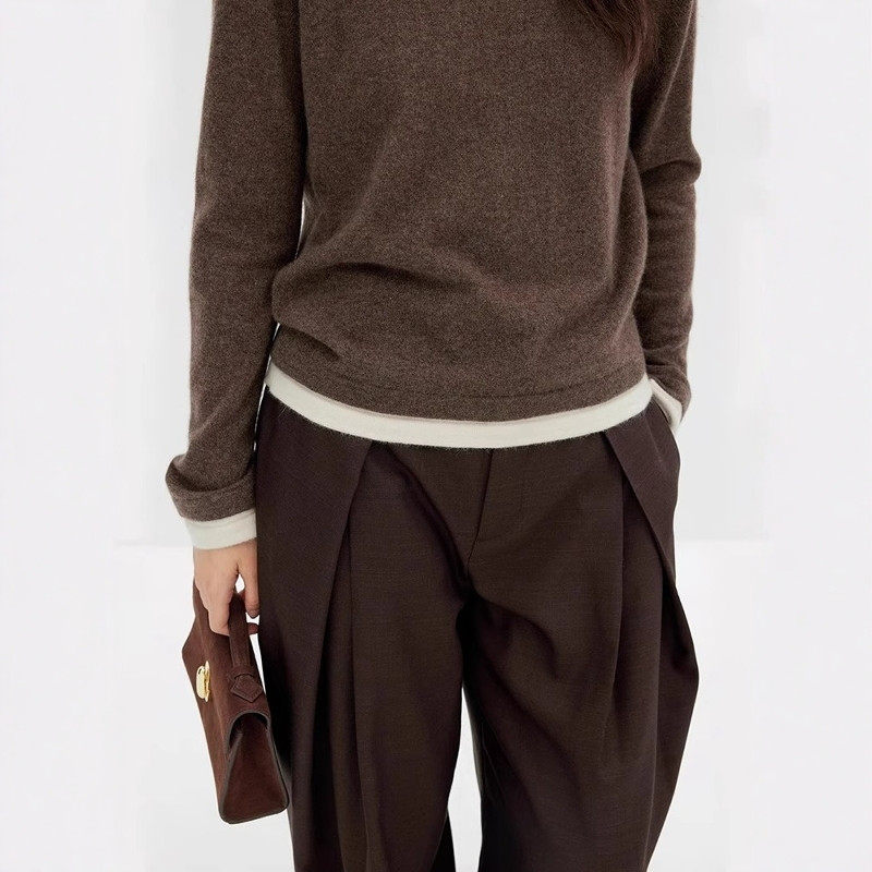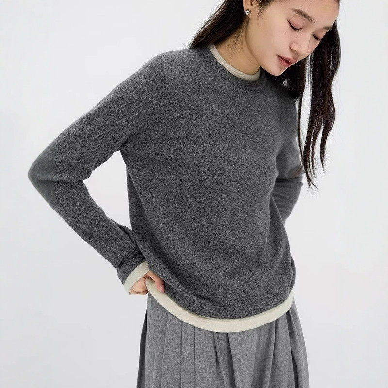 美式撞色假两件圆领羊毛针织打底衫女秋冬慵懒高级感毛衣内搭上衣