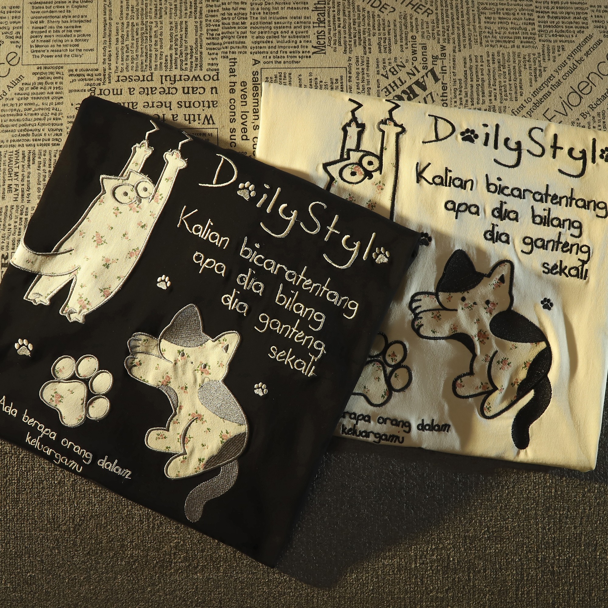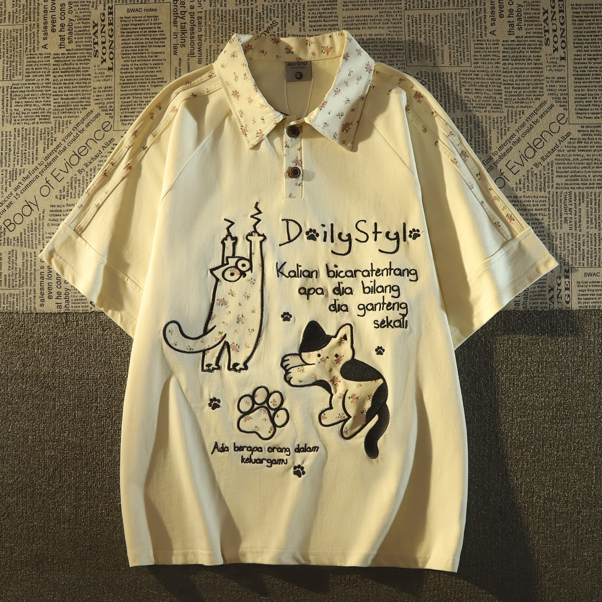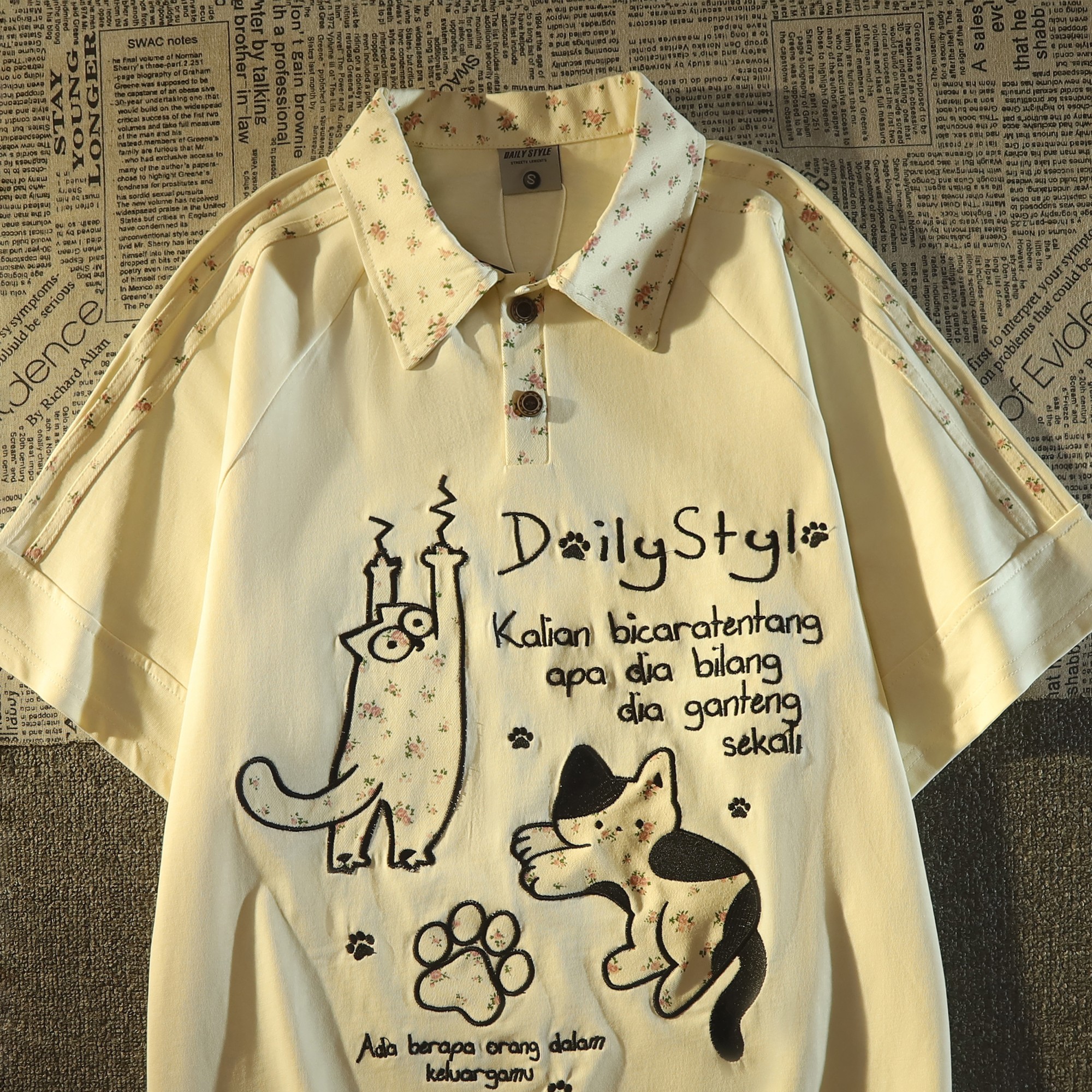 小碎花刺绣猫咪polo领短袖t恤女夏季宽松日系甜美设计感小众上衣