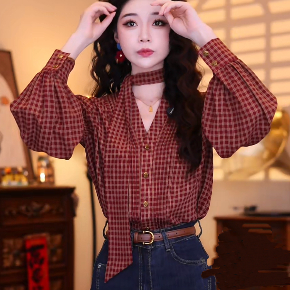 秋季实拍港复古风V领结带百搭单排扣纯色气质设计感长袖上衣女装