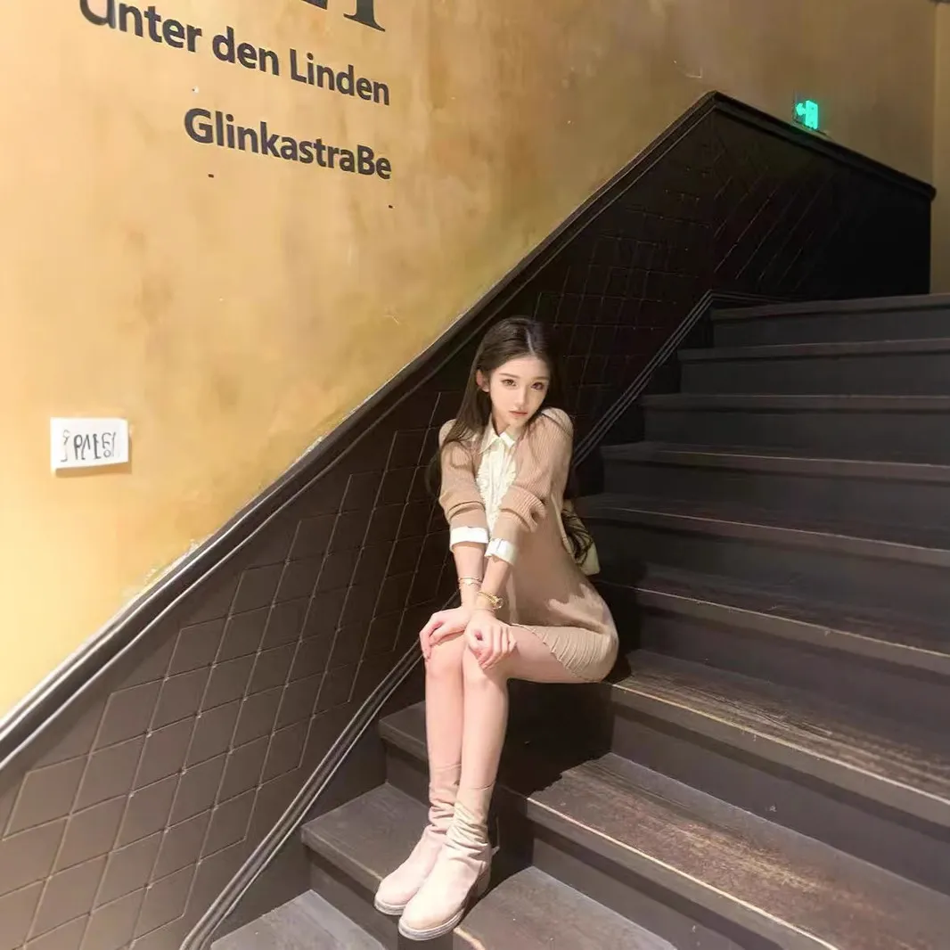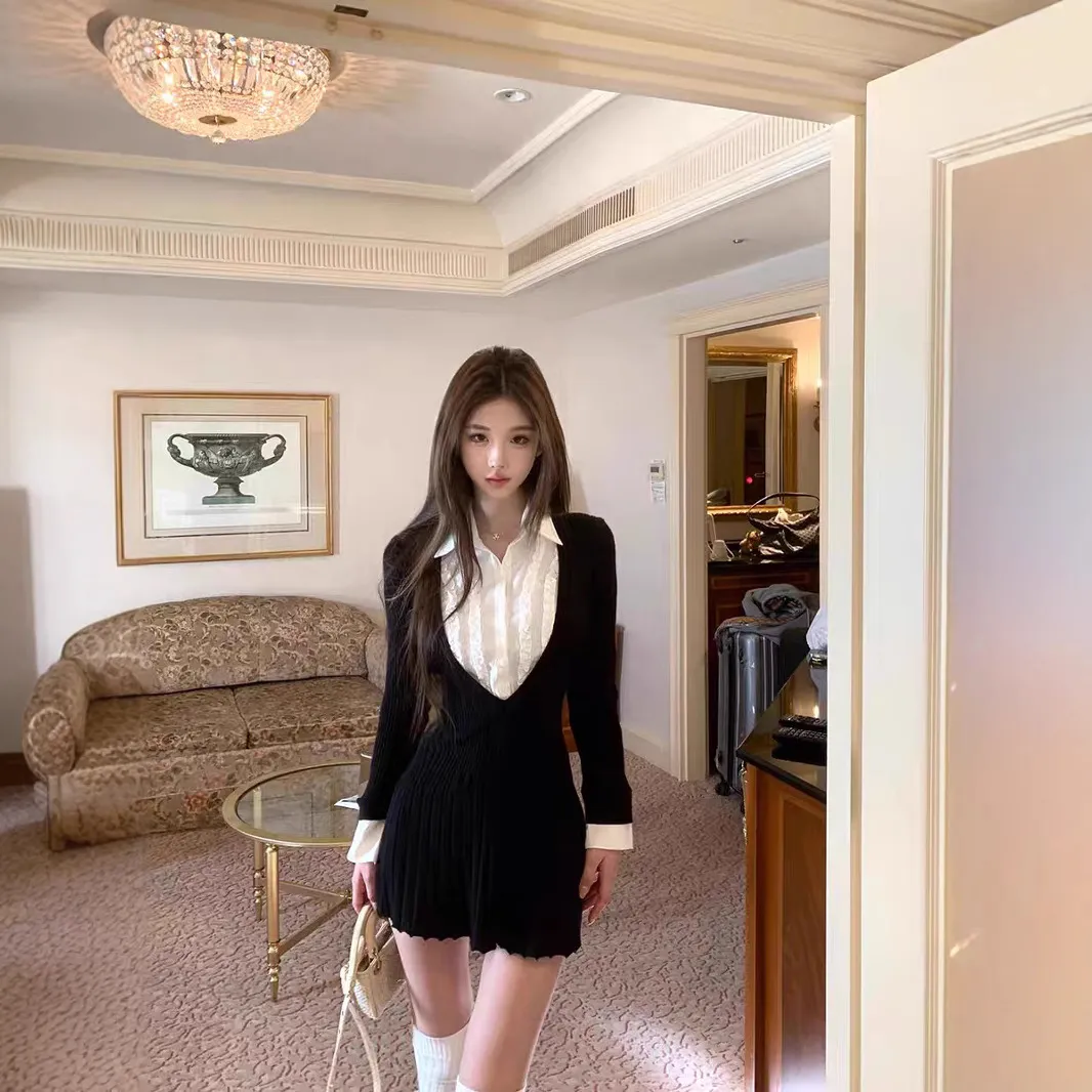 JMSHOP 纽约艺高 针织连衣裙女内搭裙假两件拼接衬衫领裙子百褶裙