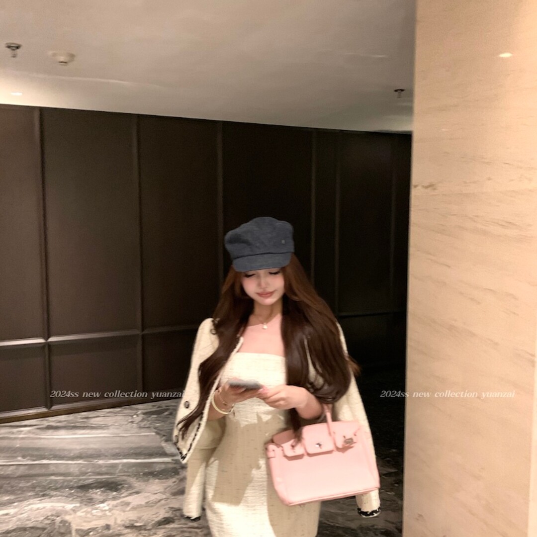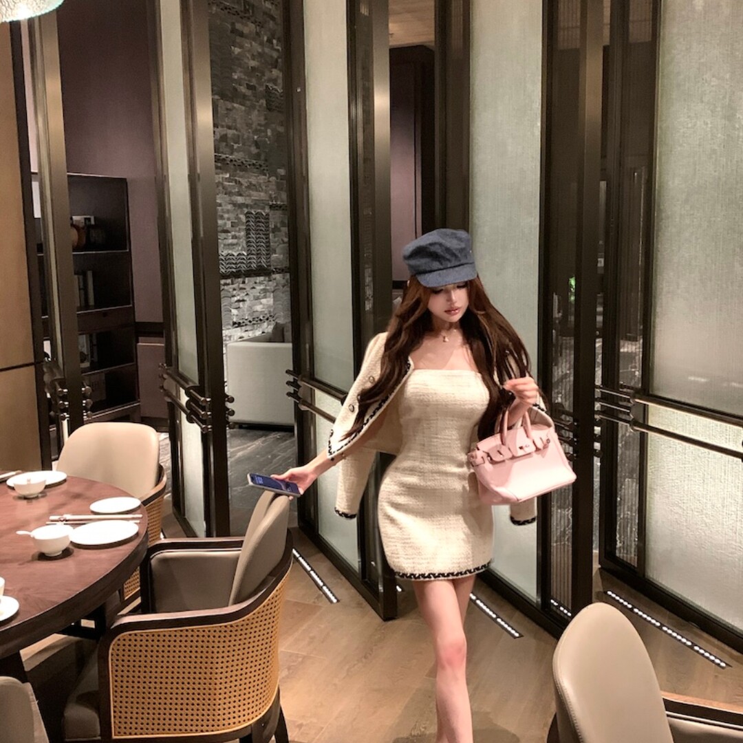 实拍实价 韩版修身显瘦拼色小香风开衫外套+抹胸包臀连衣裙套装