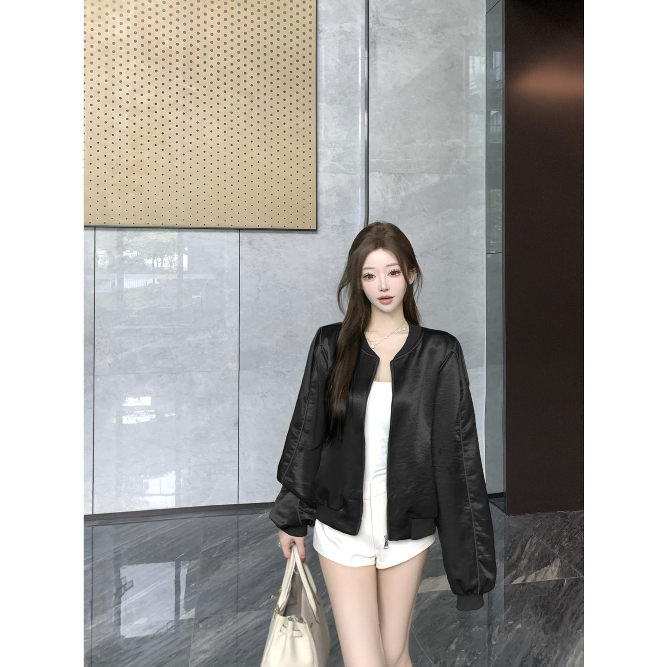 实拍欧洲站黑色棒球服立领滑料拉链开衫女装外套