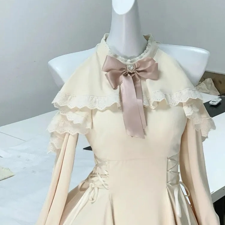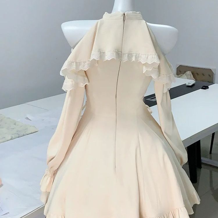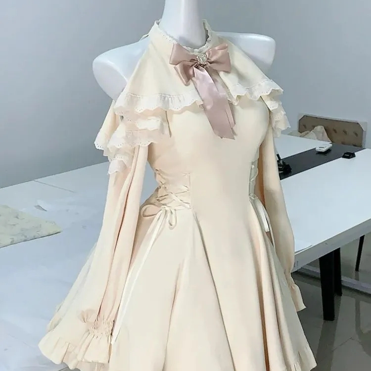 清楚系温柔风连衣裙女秋季新款蝴蝶结露肩挂脖绑带收腰显瘦短裙子