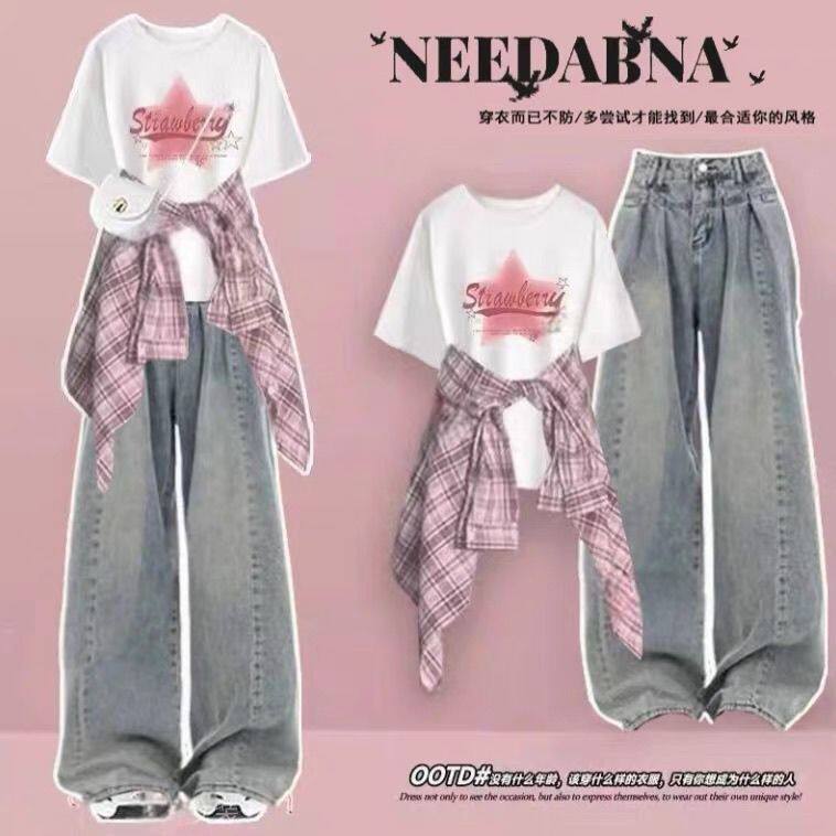 多巴胺穿搭一整套2026年爆款格子衬衫短袖T恤时尚牛仔裤三件套ins