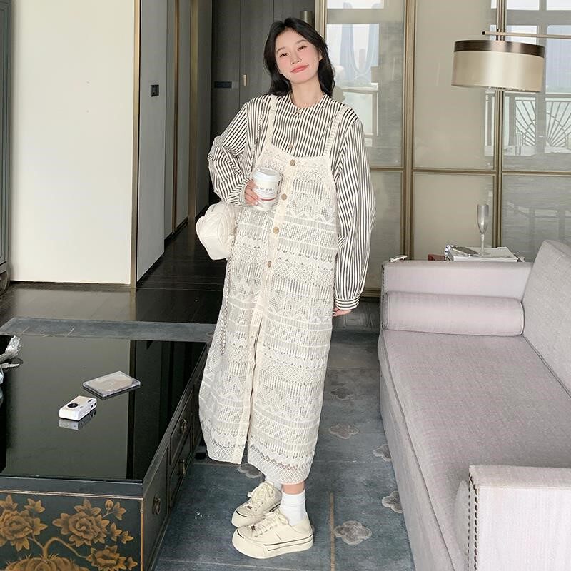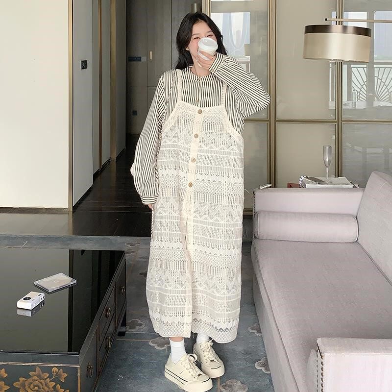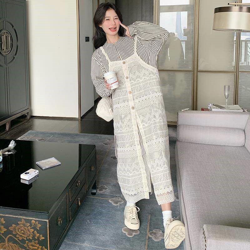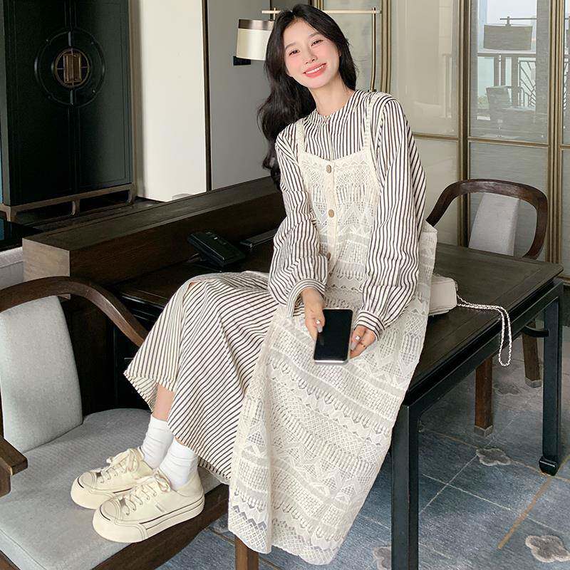 叠穿罩衫条纹连衣裙时尚套装女2024秋新款高级感减龄背带裙两件套