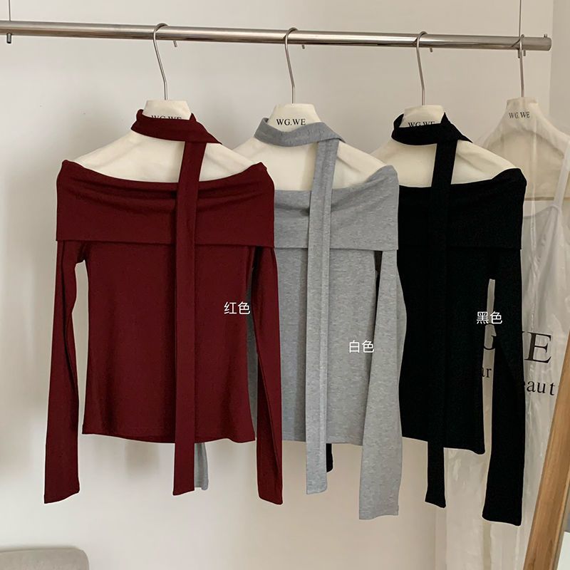 早秋露肩T恤女设计感小众修身打底衫翻领一字肩长袖莫代尔棉上衣