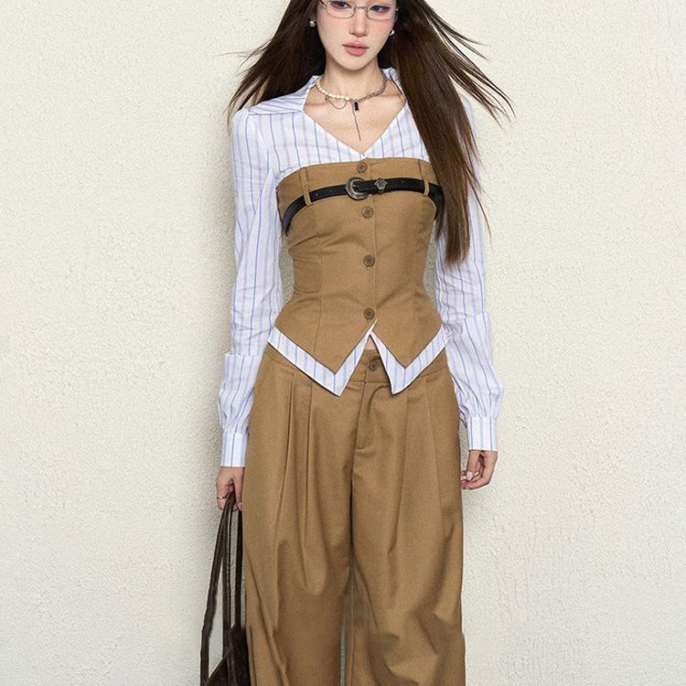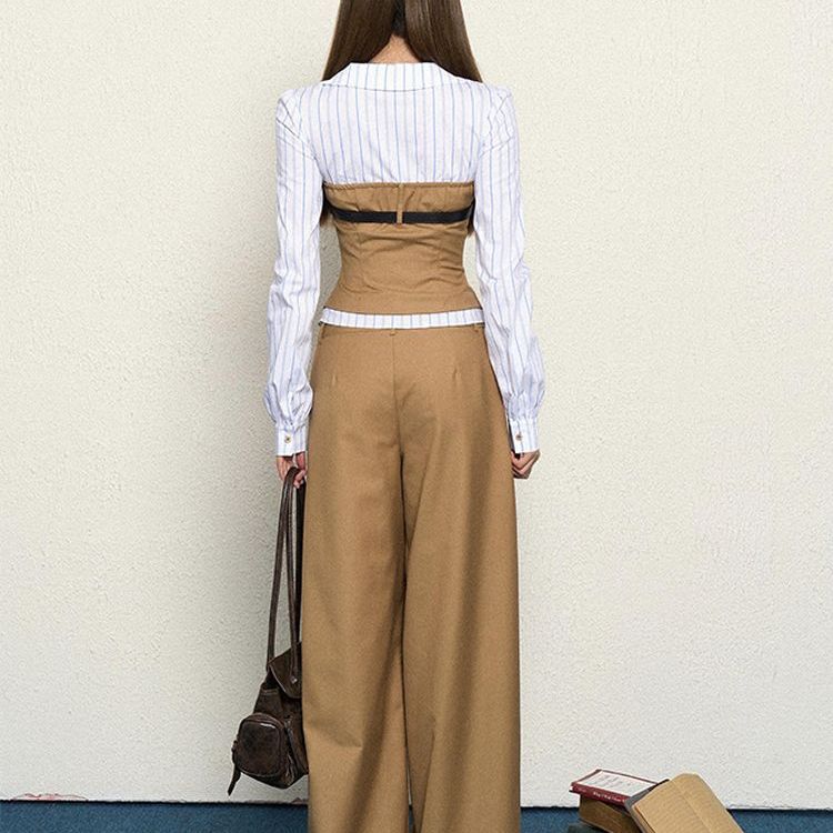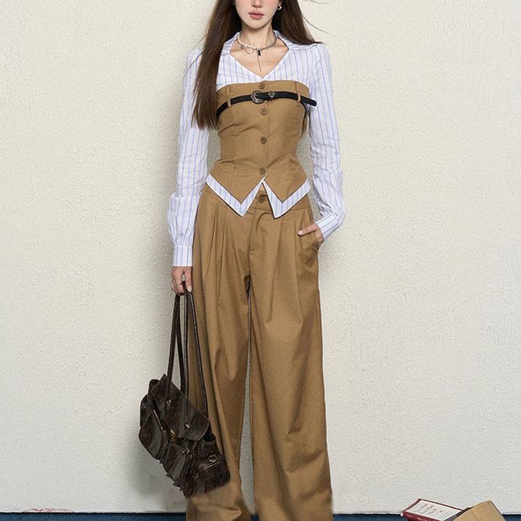 2025秋季新款老钱风设计感撞色假两件拼接长袖上衣显瘦长裤两件套