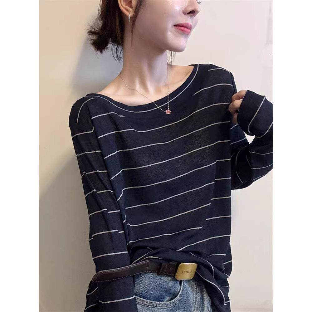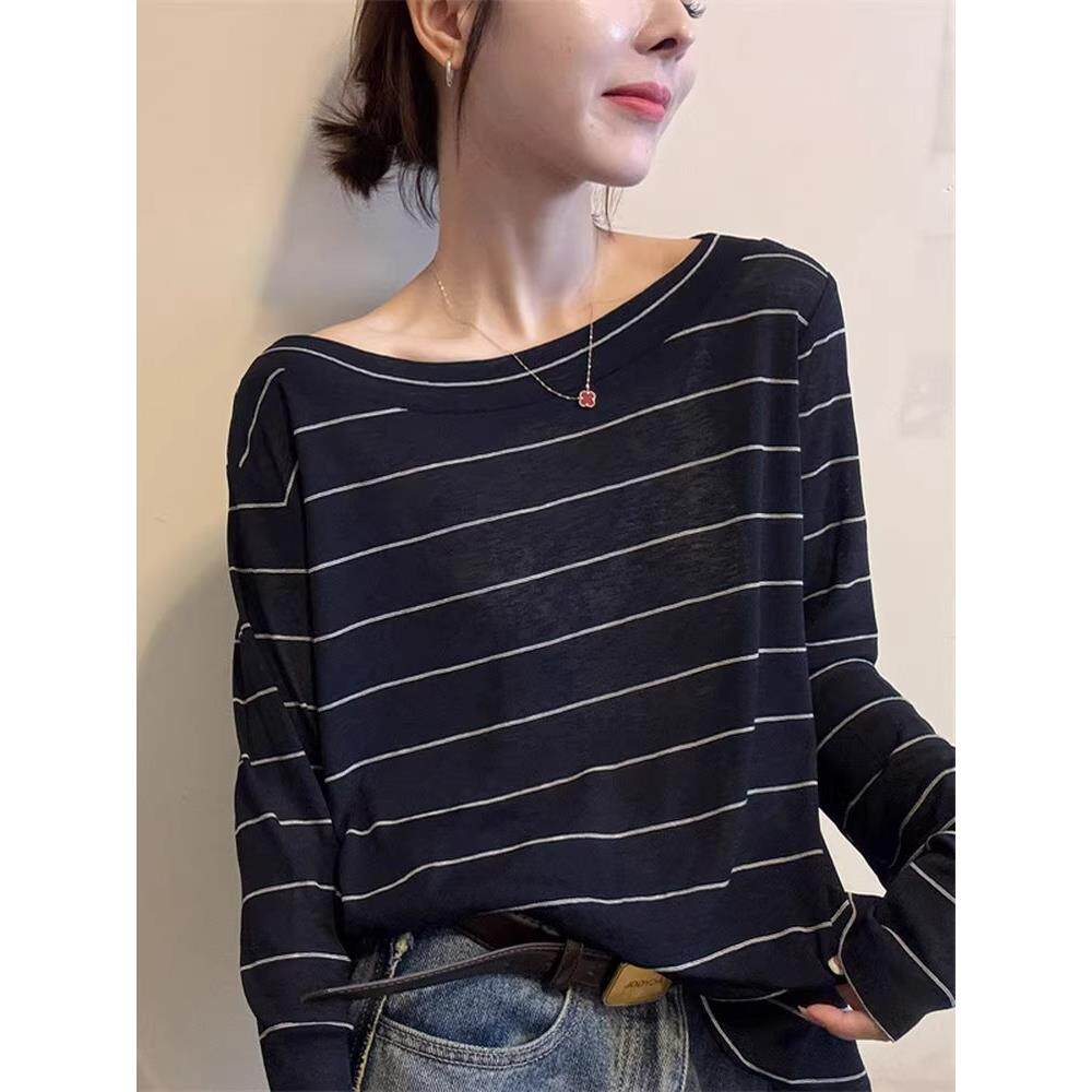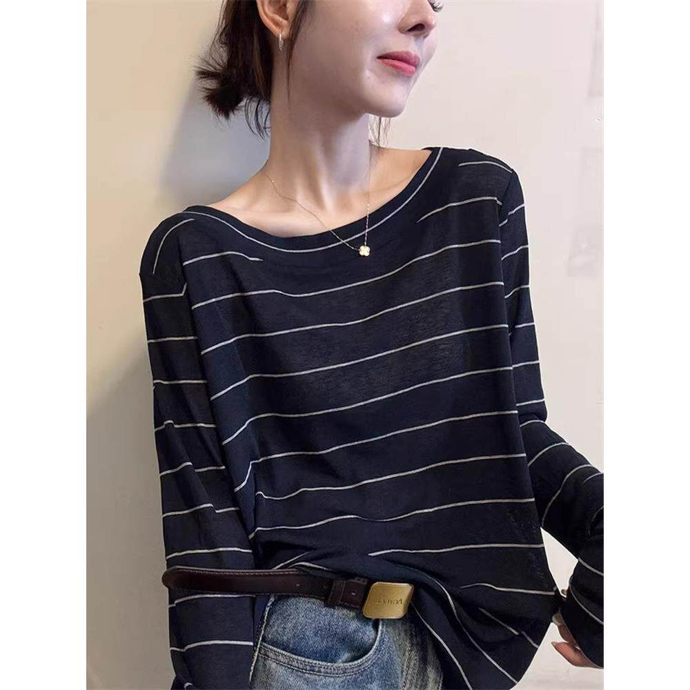 韩系时尚气质撞色条纹圆领长袖T恤女秋季宽松慵懒百搭高级感上衣