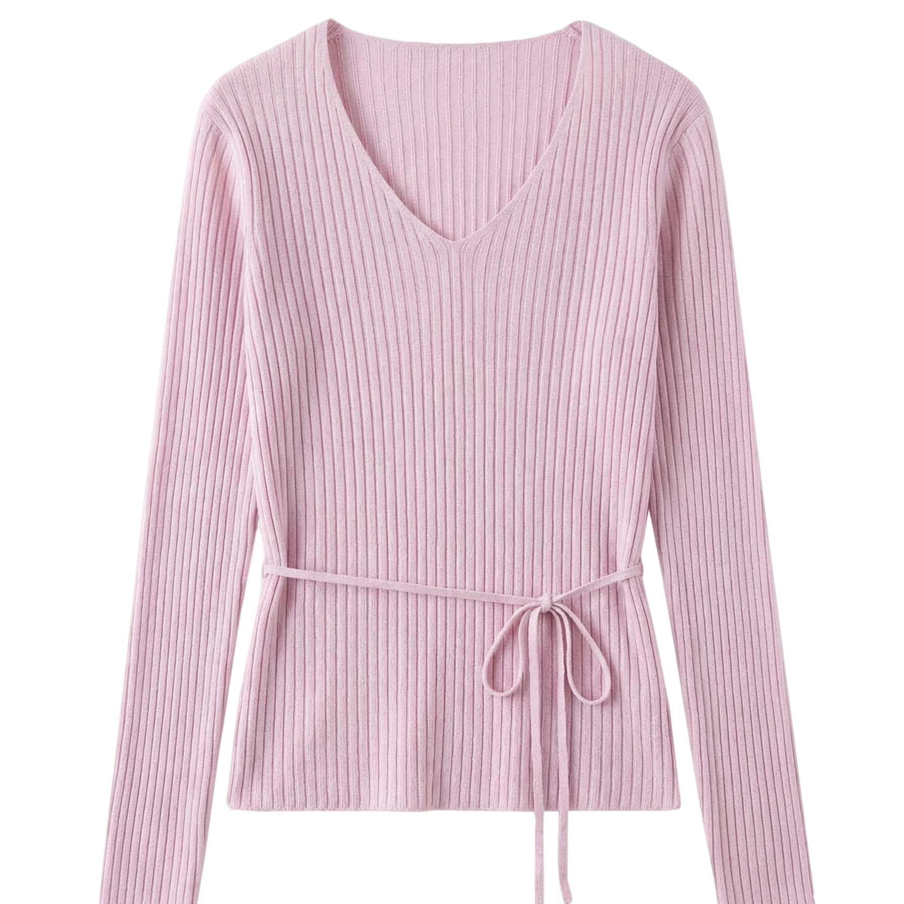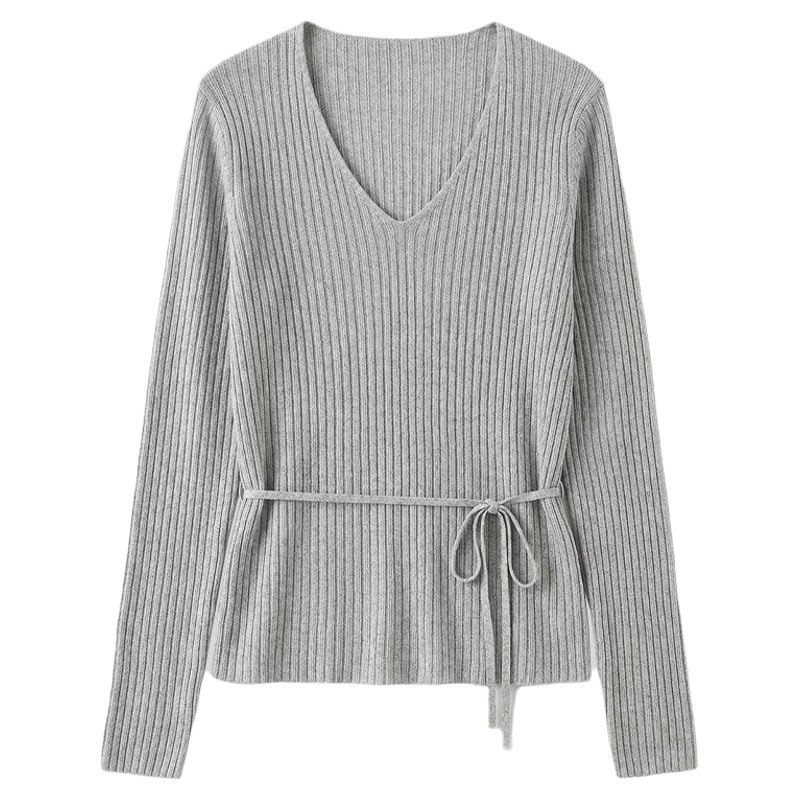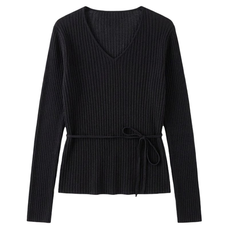 【春夏气质V领长袖收腰系带正肩竖坑条针织衫】A06030211