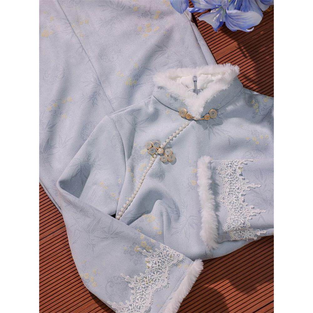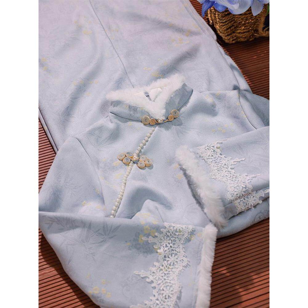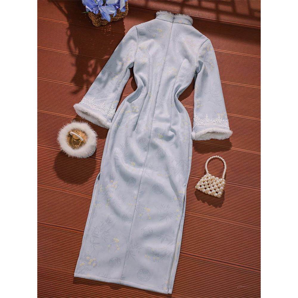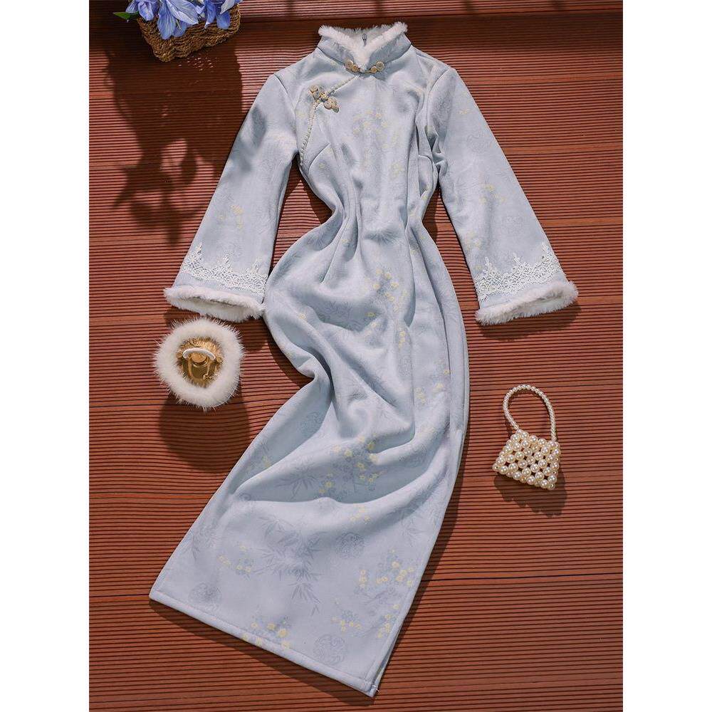 2025好看改良新款淡雅蓝色中式保暖国风加绒旗袍气质中长连衣裙