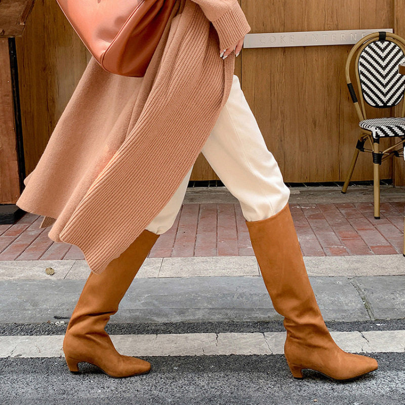 韩版方头直筒宽筒显瘦高筒靴套筒时装靴高跟优雅骑士靴子