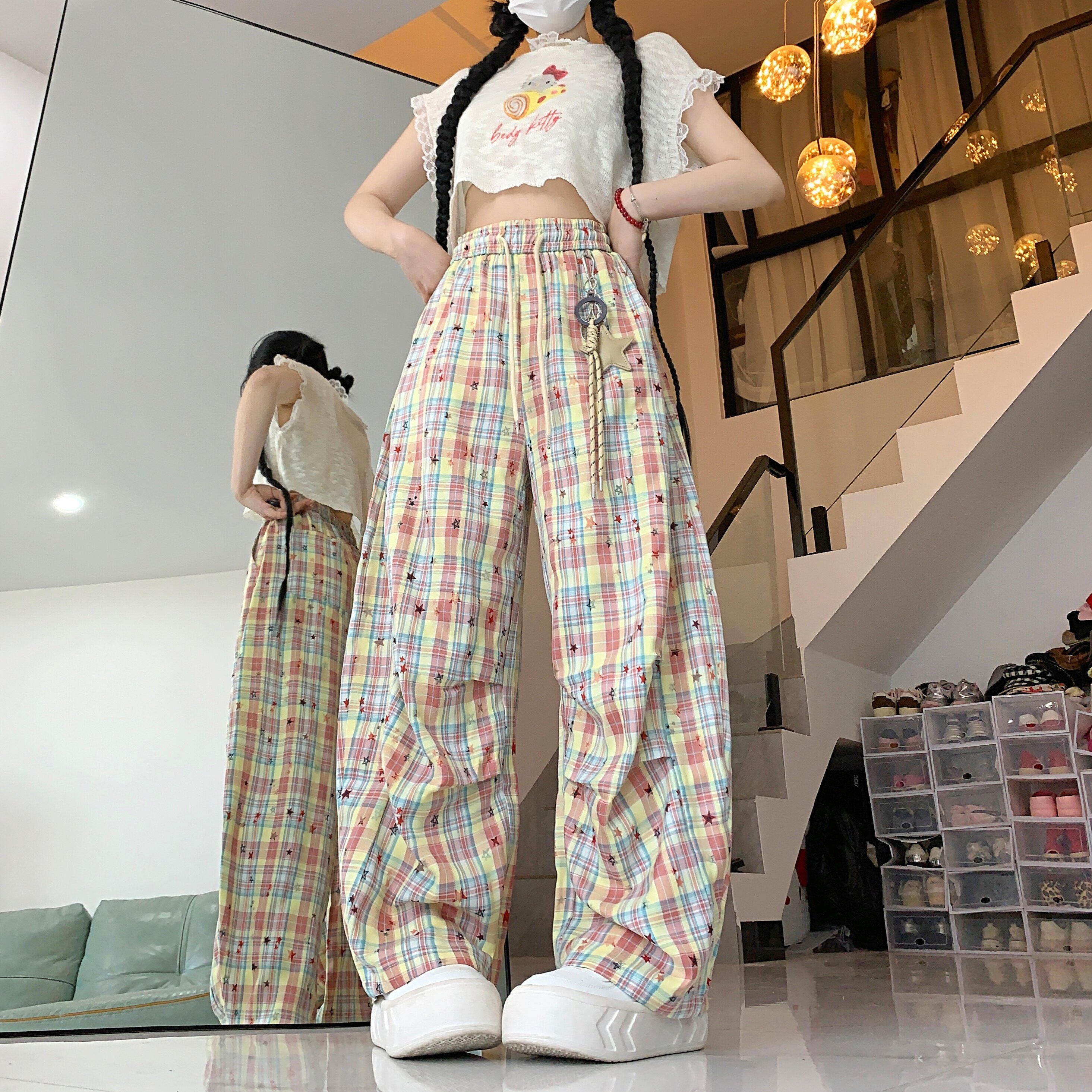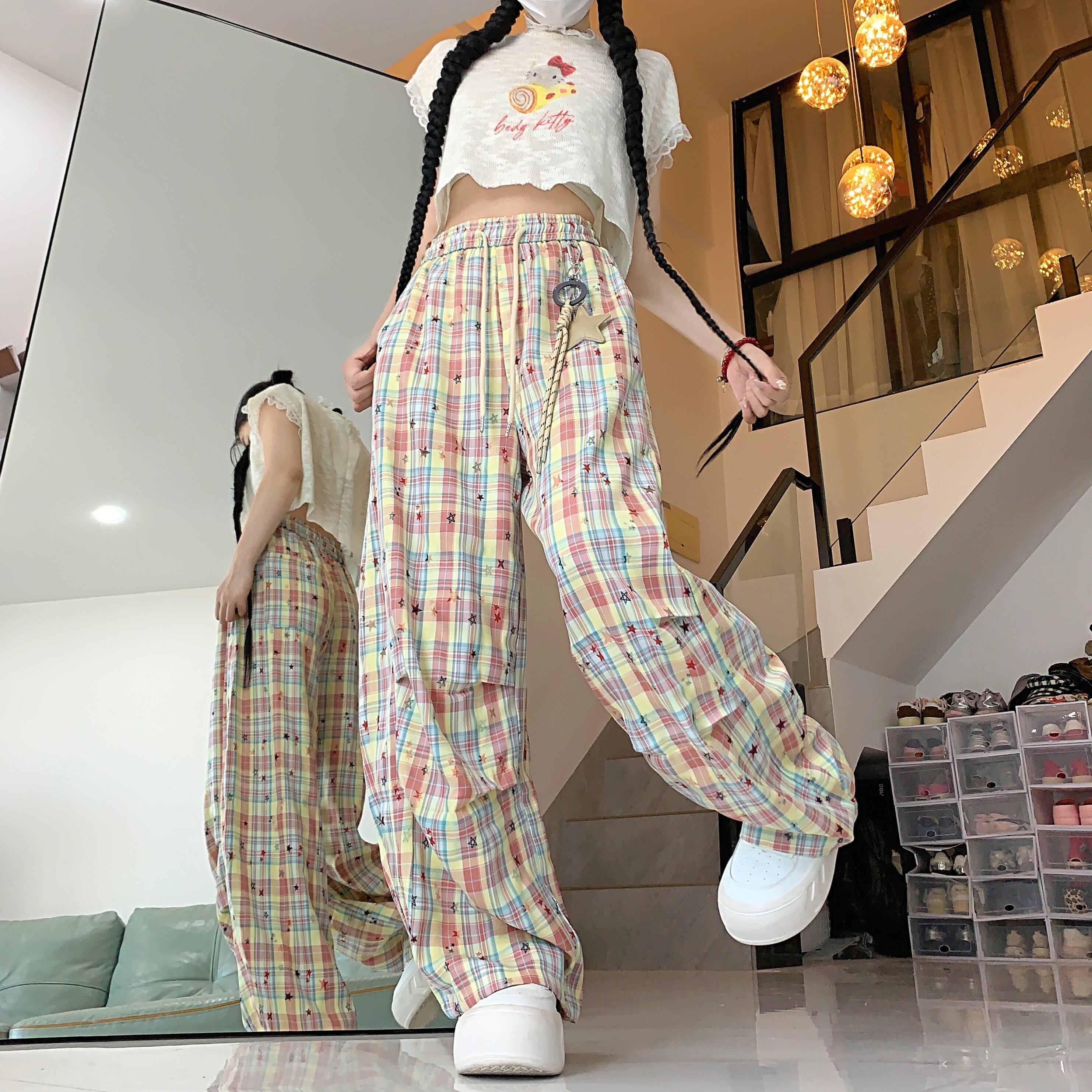 实拍多巴胺格子星星挂饰休闲裤夏季女松紧腰褶皱阔腿宽松长裤