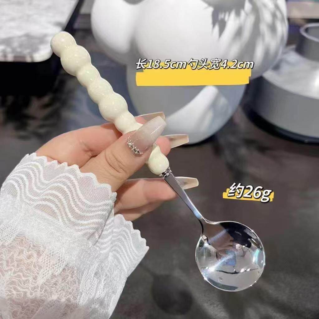 四色珍珠不锈钢勺子仿陶瓷手柄家用餐勺高颜值耐高温圆勺汤匙