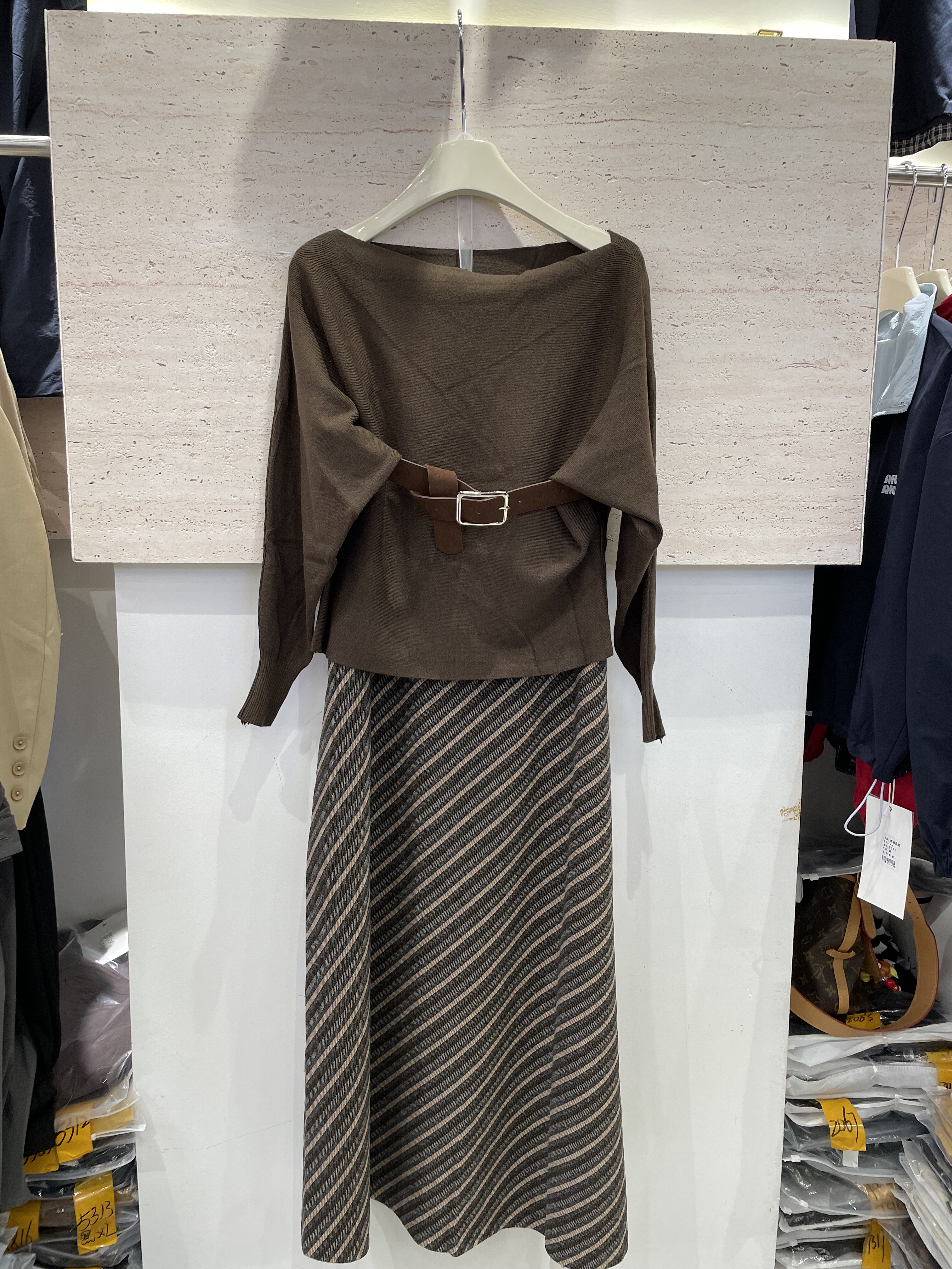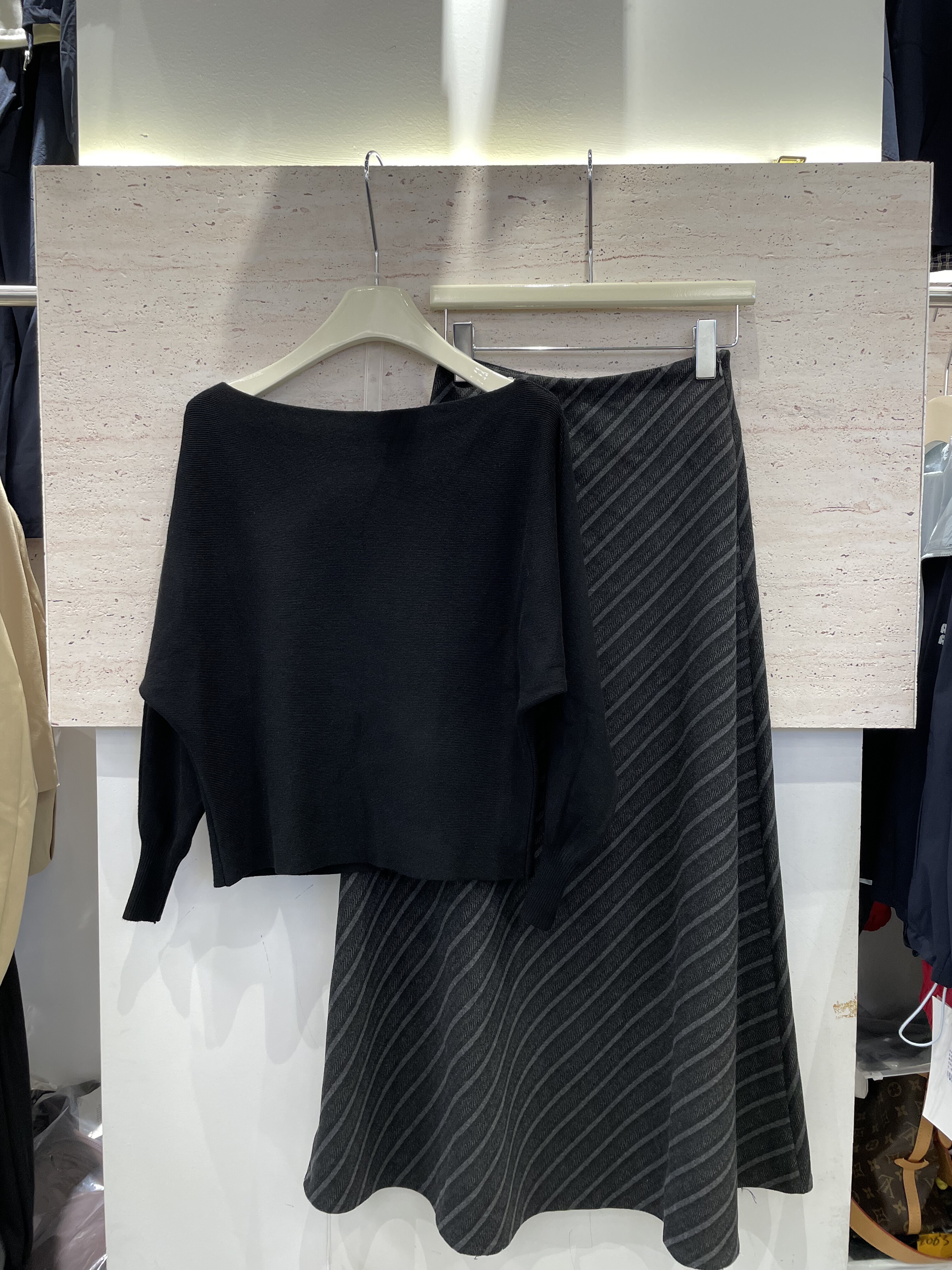 尚品荟A53秋宽松显瘦针织毛衣一字肩上衣+条纹针织半身裙两件套女