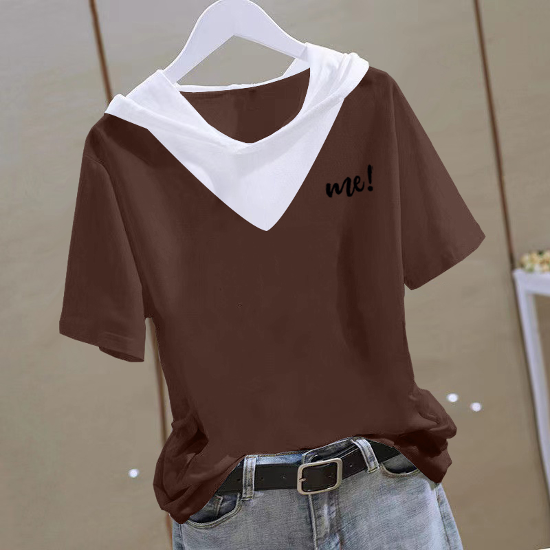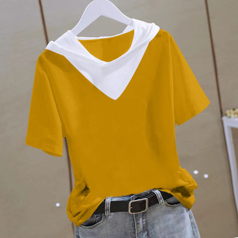 纯棉短袖连帽t恤女夏季新款韩版大码宽松洋气拼色假两件半袖卫衣